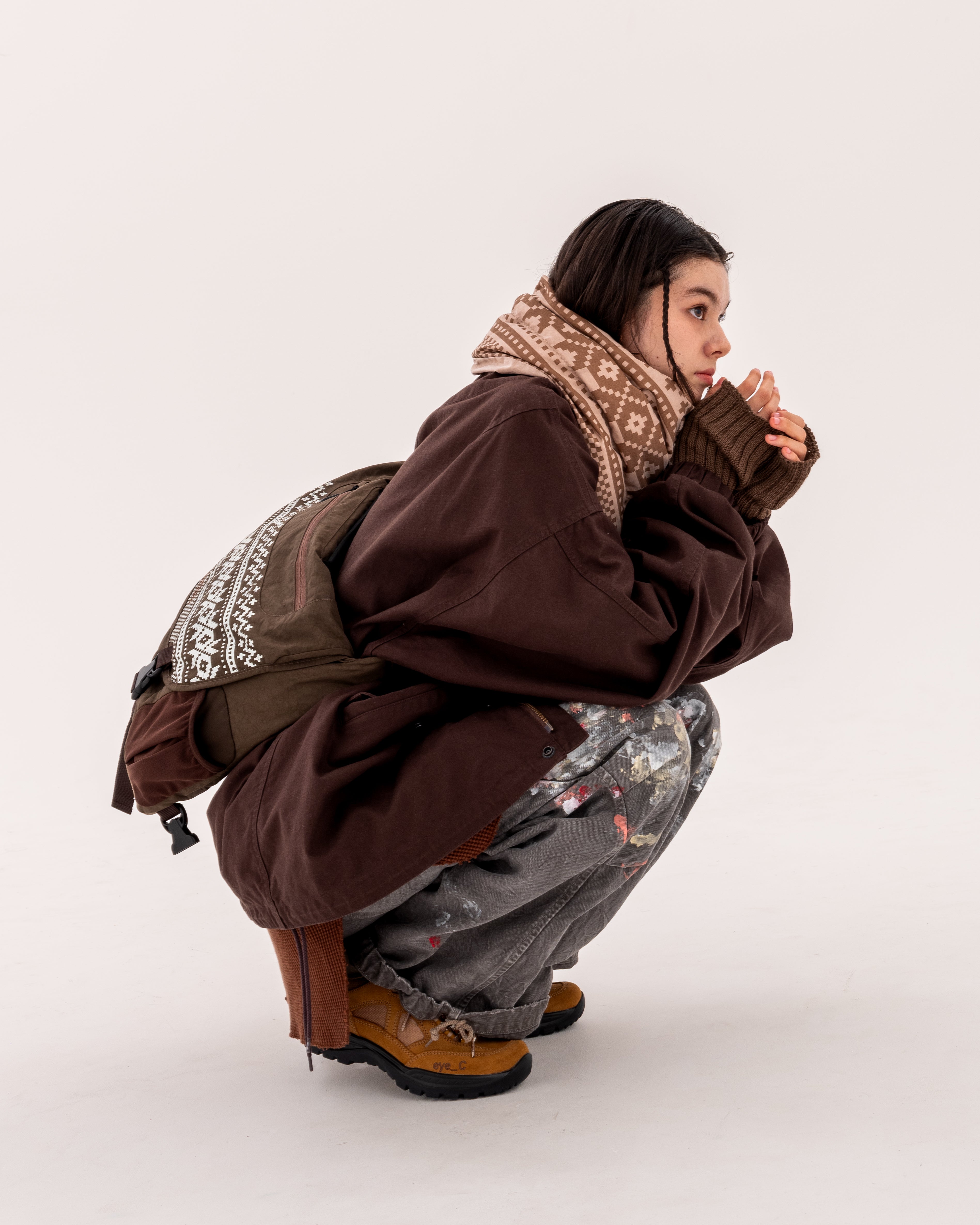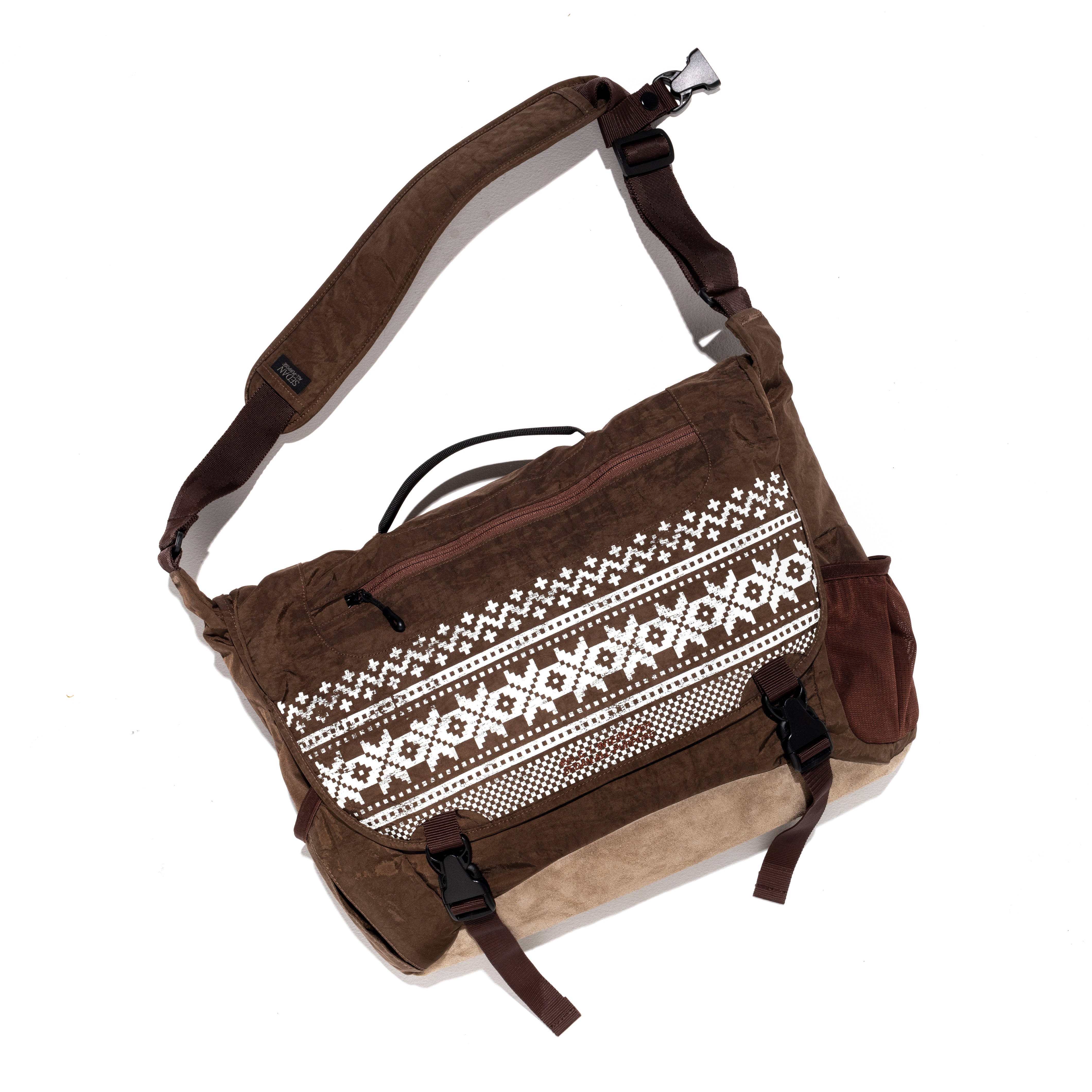 メッセンジャーバッグも同様にインラインのモデルをベースにし、今回のコラボアイテムに共通して使用されているノルディック柄が少し擦れた状態で大胆にプリントされています。本体は製品染めされたムラのある独特なナイロンに、底面のスウェードを組み合わせています。収納力も充実しており、3点留めも可能です。
