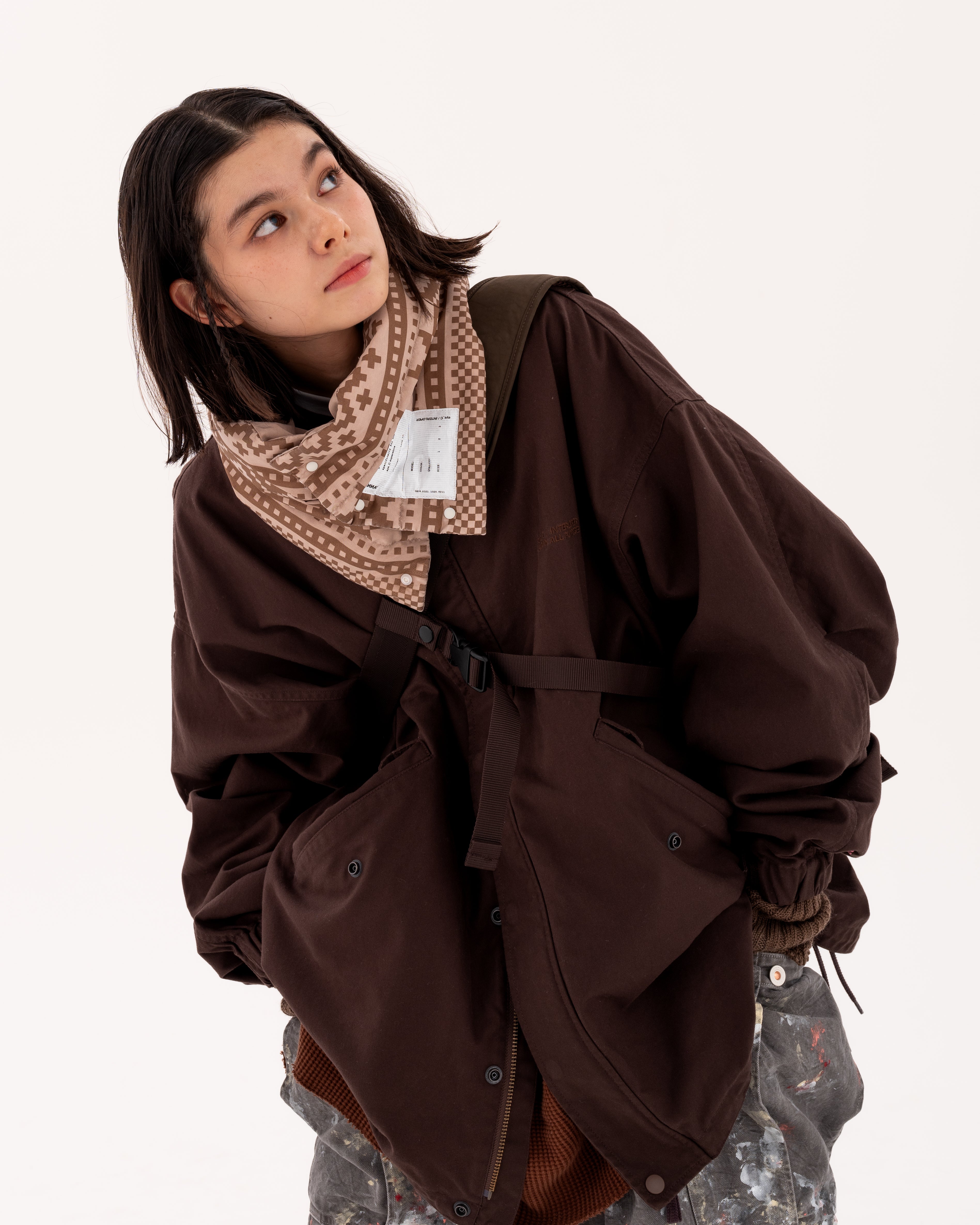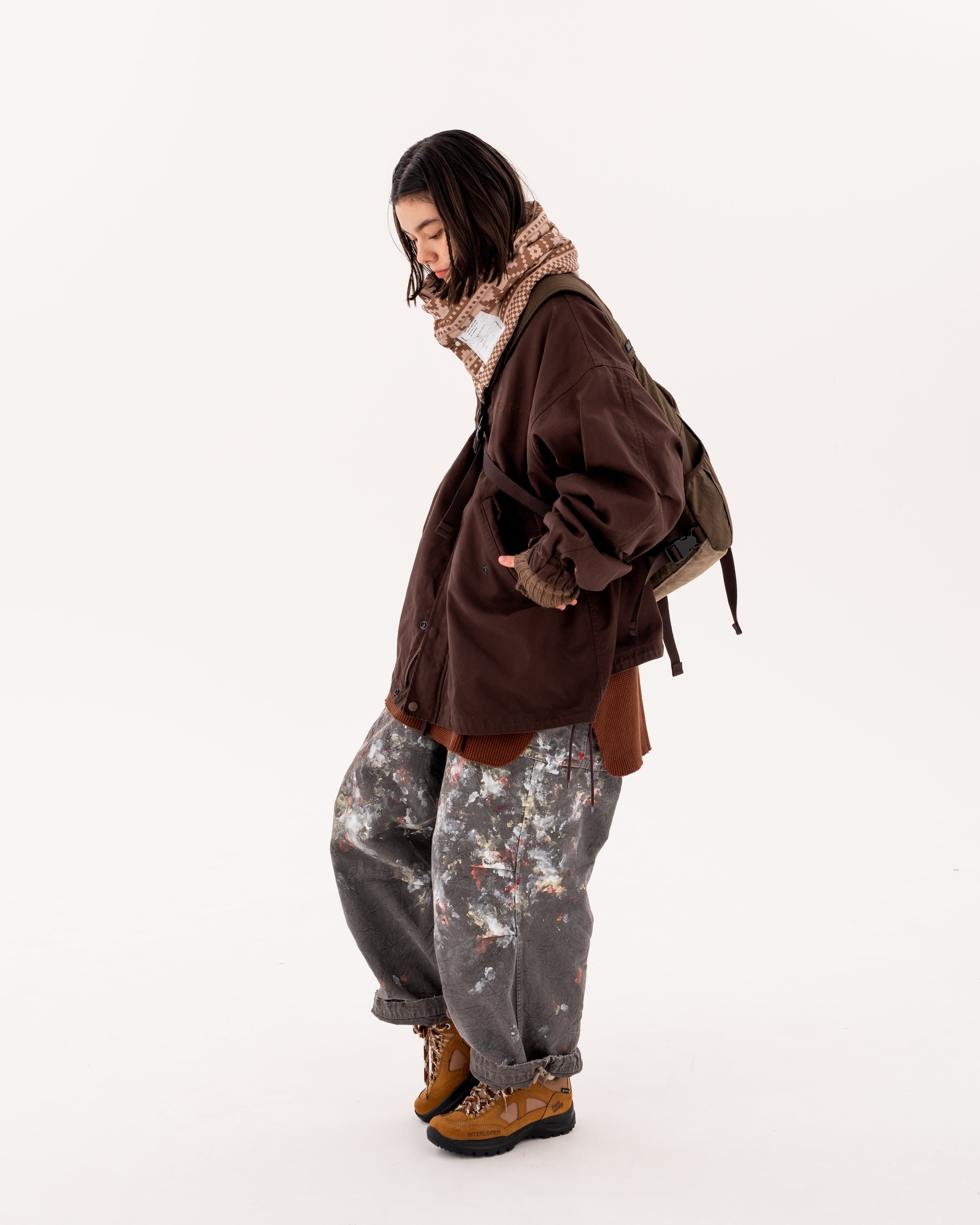 今回はeye_Cとともにジャケット、メッセンジャーバッグの2型を作成。ジャケットはインラインで展開していたショートモッズをベースに、スタンドカラーやサイドのドローコードなどeye_Cらしいアレンジが加えられ、特徴的なピンクカラーで内側のプリントや袖の刺繍がアクセントとなっています。生地はソフトなダック生地となっており、胸には同色の刺繍が入ります。
