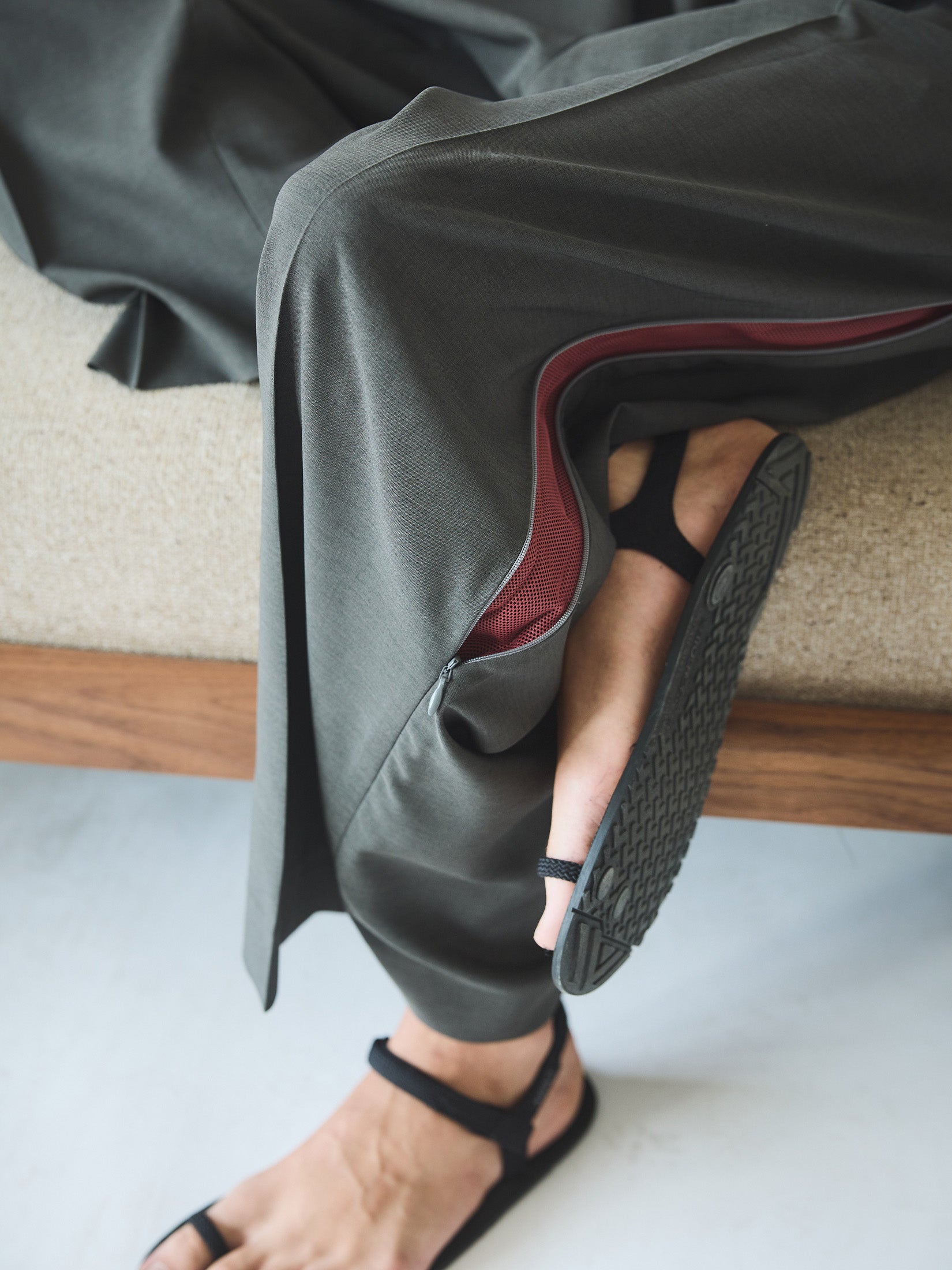 我々は夏でもフルレングスで過ごしたいんだ…という熱い気持ちが宿ったワイドスラックスです。FW23で合繊のフランネル調素材で作ったワイドスラックスがすこぶる好調で、すぐに完売したあのパンツのディテールをそのままに、サイドにベンチレーションを搭載して今シーズンにも登場。ストレートなシルエットにトロピカルウールのようなポリエステルを使用し、履き心地はとても軽くて爽快。通気性、ウエストのゴム、洗える生地という機能美と、カラーの効いたベルト止めやメッシュのちょっとした遊び心、シンプルですが最高の仕上がり。夏の長パン派の同志は是非。