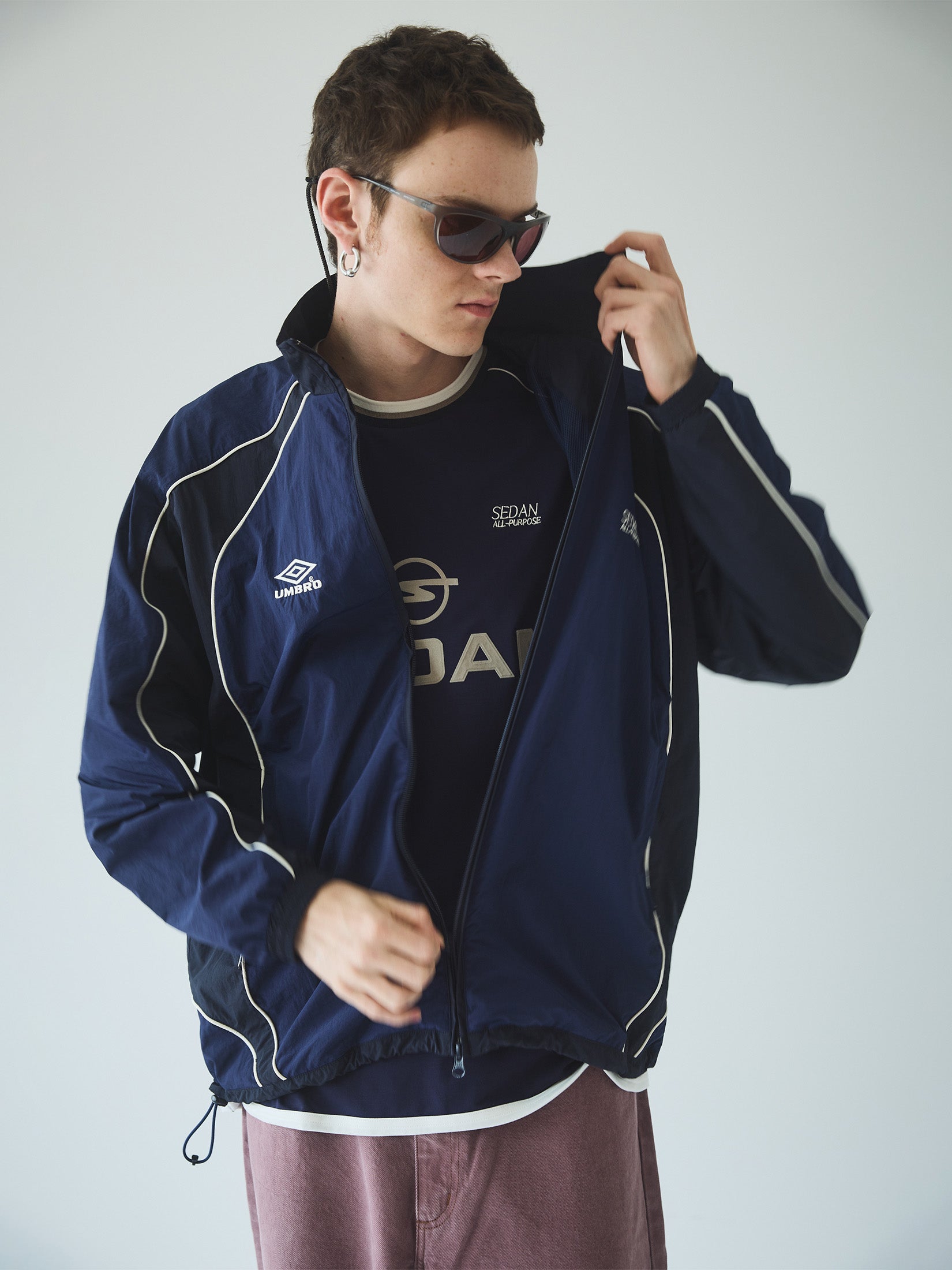 まずこちら、SEDANらしく懐かしくもあり、新しくも感じる要素が散りばめられたブルゾンで、配色や流線的なパイピングはスポーティーでありながらもY2Kを意識したデザインとなっています。胸にはシンプルにSEDANのロゴ刺繍と80年代のUMBRO®ロゴが並び、背面の腰部分にはクラシックかつインパクトのあるアップリケ刺繍入り。中は身頃も袖もメッシュになっていたり、サイドポケットがファスナー付きだったりと街からサッカーコートまでシームレスに着用出来ます。SEDANのインラインと比べるとサイズ感はコンパクトになっています。裾がゴムで絞れるので、キュッとしてデニムと合わせるのも最高ですね。