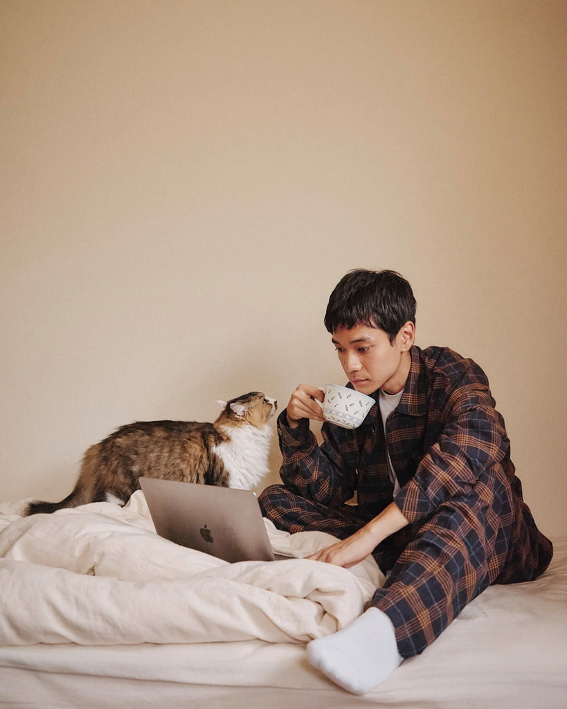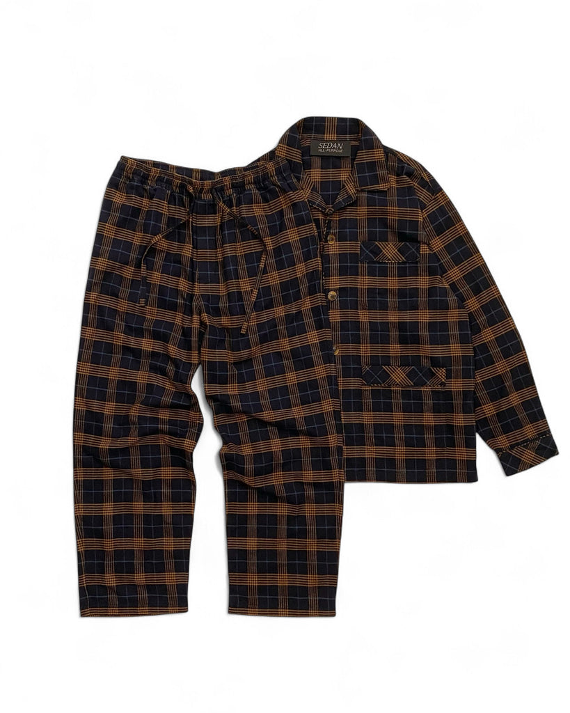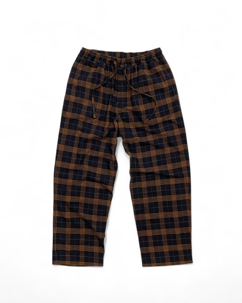 今回は既にリリース済みの「Plaid Sleeping Jacket」に合わせ、パンツもあるセットアップなら更に良いなということでインラインにはないスリーピングパンツを別注。さらにセットアップで着たくなるよう、上下ともにブリティッシュさを感じるネイビー×イエローのチェックパターンもエクスクリーシブカラーで作りました。ジャケットはサッと羽織れるライトな作りで、シャツジャケットとしてこれからの時期に重宝します。パジャマシャツにはお馴染みのポケットもあり、冬はレイヤードアイテムとしてアクセントに。パンツはジャケット同様ゆったりとしたリラックスフィットで、テーパード感少なめのイージーパンツ仕様。一度履くと病みつきになります。室内も室外もシームレスに着れるので、セットアップで是非。