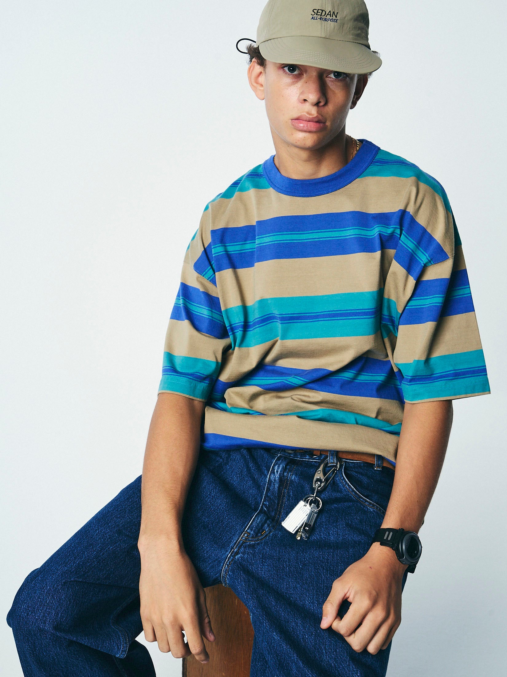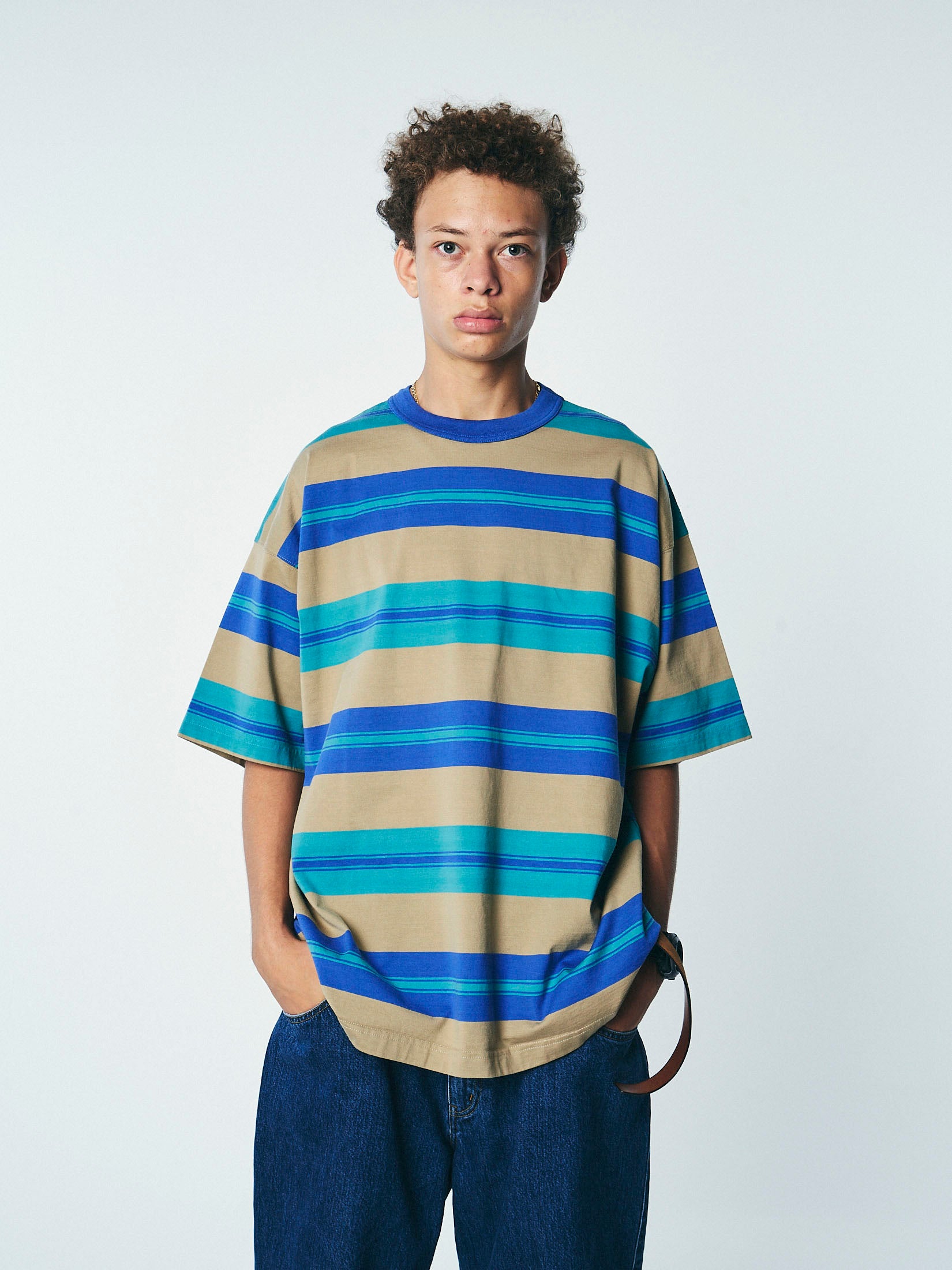 またしても一週ずれてのリリース、すみません。最近は少し天気もご機嫌斜め気味ですが、地域によっては花見だったり、気温の高い日はTシャツ姿の人を見かけるなどすっかりいい感じの春になってきましたね。ということで今から夏にかけておススメしたいTシャツの一つがこれ。太いマルチボーダーにルーズなシルエットがちょっと懐かしさを漂わせます。
