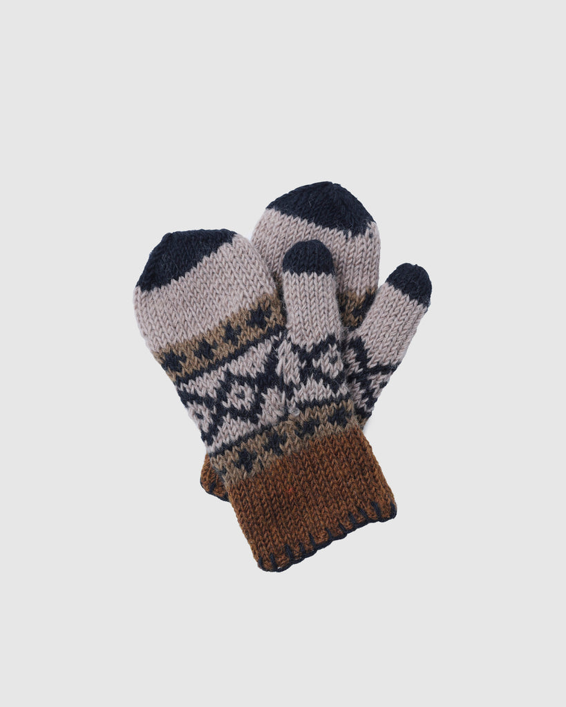 ネパールで手編みして作ってもらったミトンです。あったかそうな太番手のウールで、裏地にはフリースが付きます。民族調の柄2色と無地2色の展開。ワンサイズ展開です。