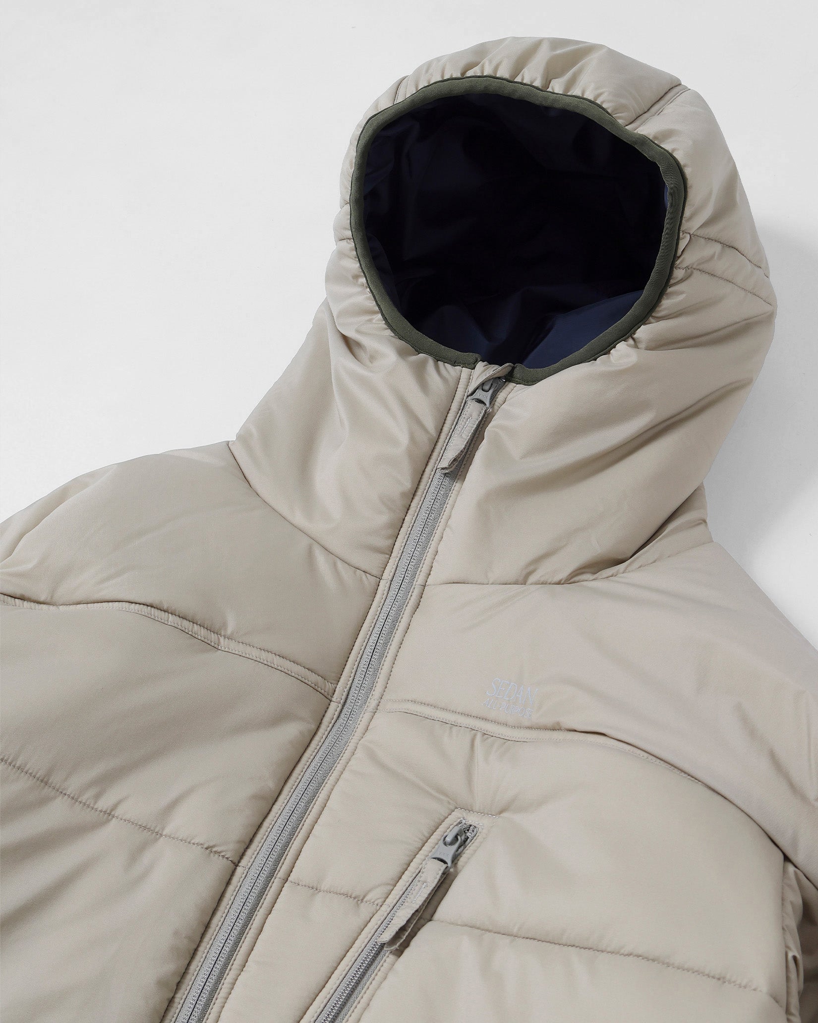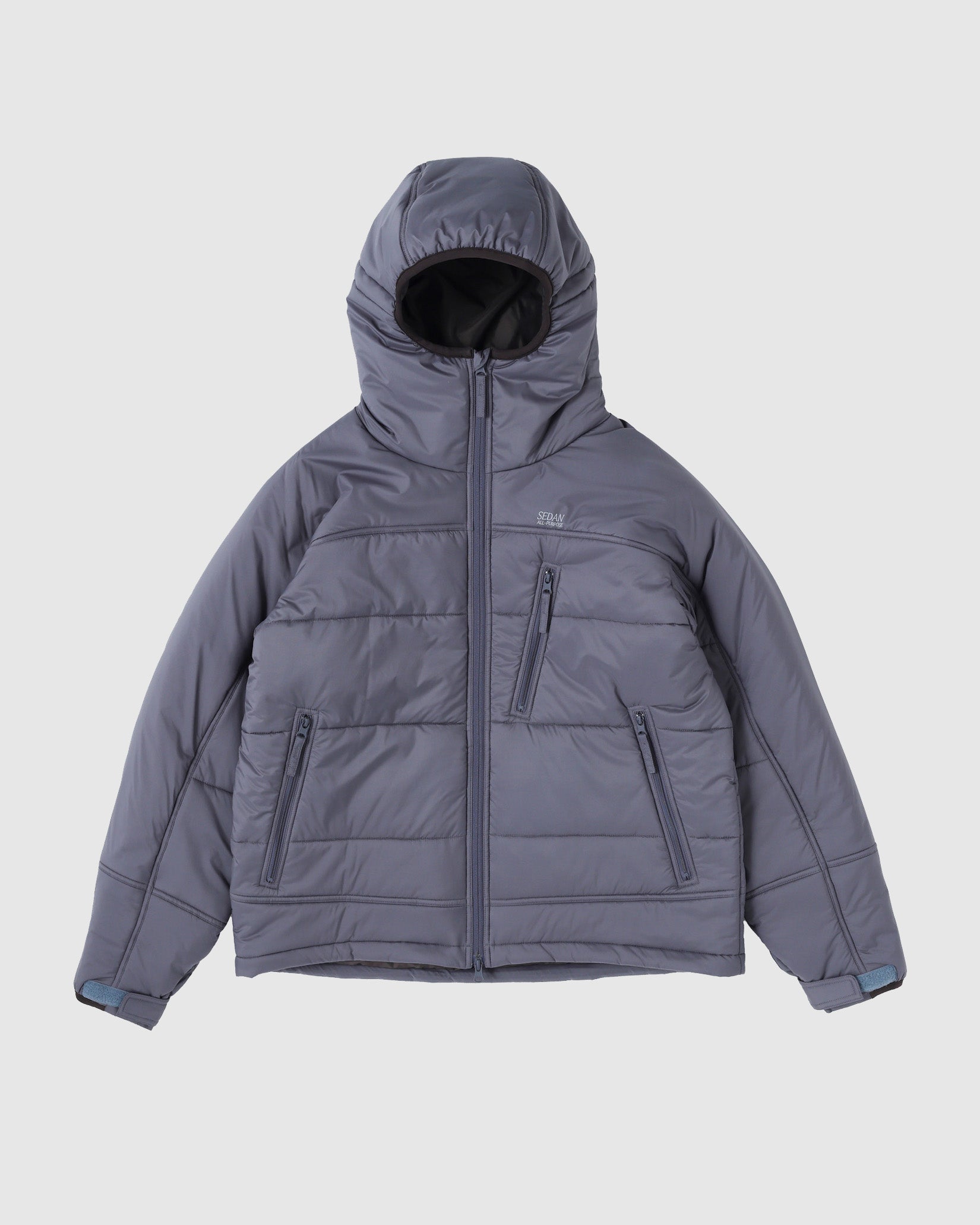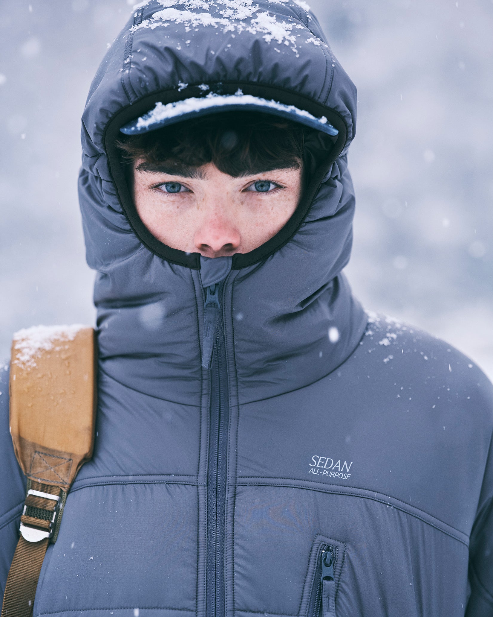 ダウンも好きだがそれ以上によく着ているのが中綿入りのジャケット。軽い、洗える、あんまりスタイル選ばない(ような気がする)とサクッと着るのにちょうどいいのだ。さらにフードが付いていたら最高ということで、大好きなあのモデルをベースに一番欲しい中綿のアウターを作った。シェルには防風性の高いマイクロリップ生地を使用。リサイクルナイロン100%の生地はほどよくマットで裏地との配色も最高。アウトドアから街まで違和感なく着れる。フードもボリュームがあり、被ったスタイルもよい、セダン的推しの一着。胸にセダンのロゴ刺繍。フードの後ろ、身頃裾にアジャスター。ビッグサイズの内ポケット2つ。