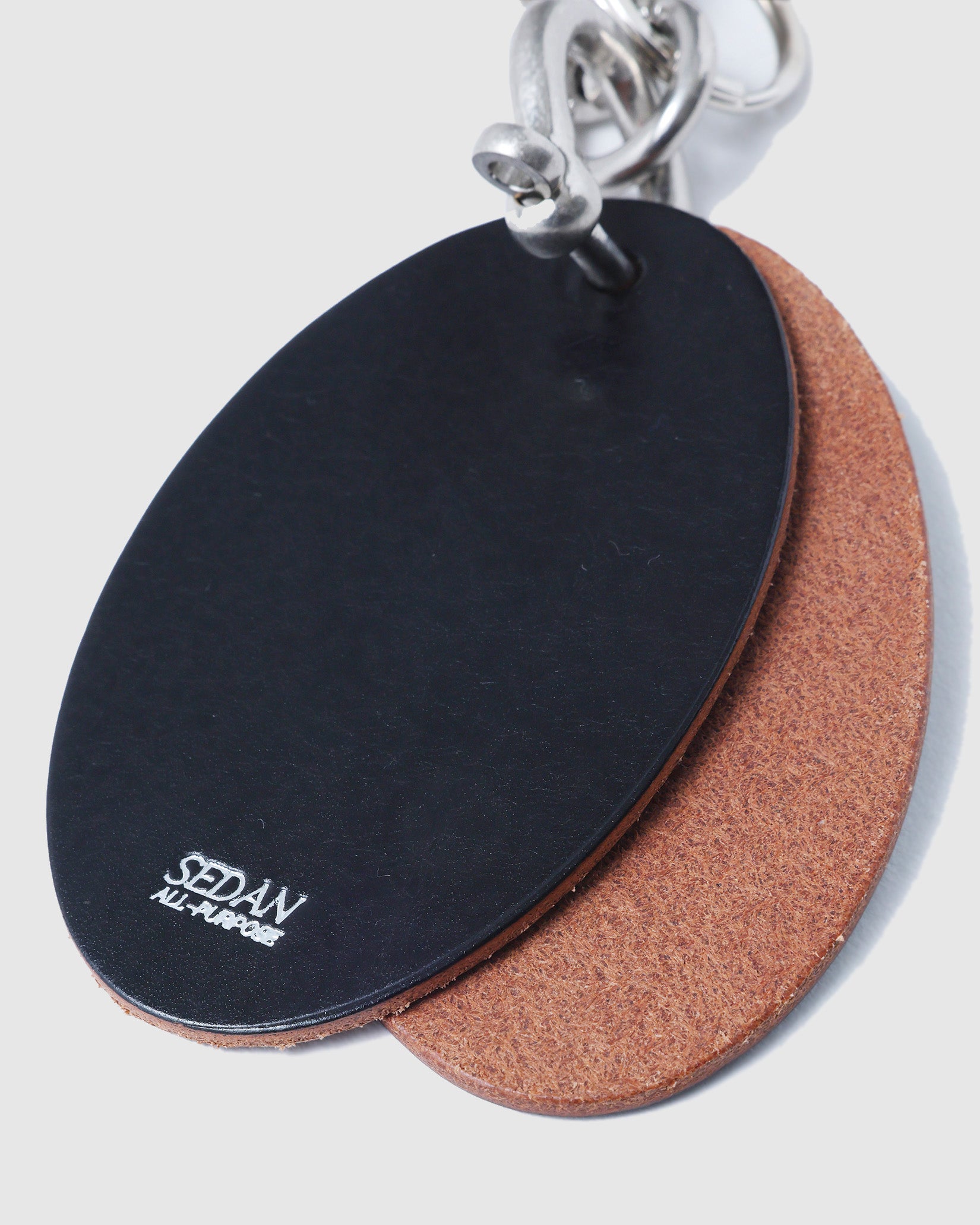 キーホルダーを腰からぶら下げたい勢の期待に応えるべく、大人がぶら下げても恥ずかしくない、本革でどっしりした物を作った。イタリアの牛革でSEDANの下げ札サイズのオーバル型。鍵を3本くらいは付けられるサイズ感。パンツに下げたり、バッグに付けたりとお好きなところでジャラジャラさせてください。NA'VVYに作ってもらったハンドメイド・イン・ジャパン。