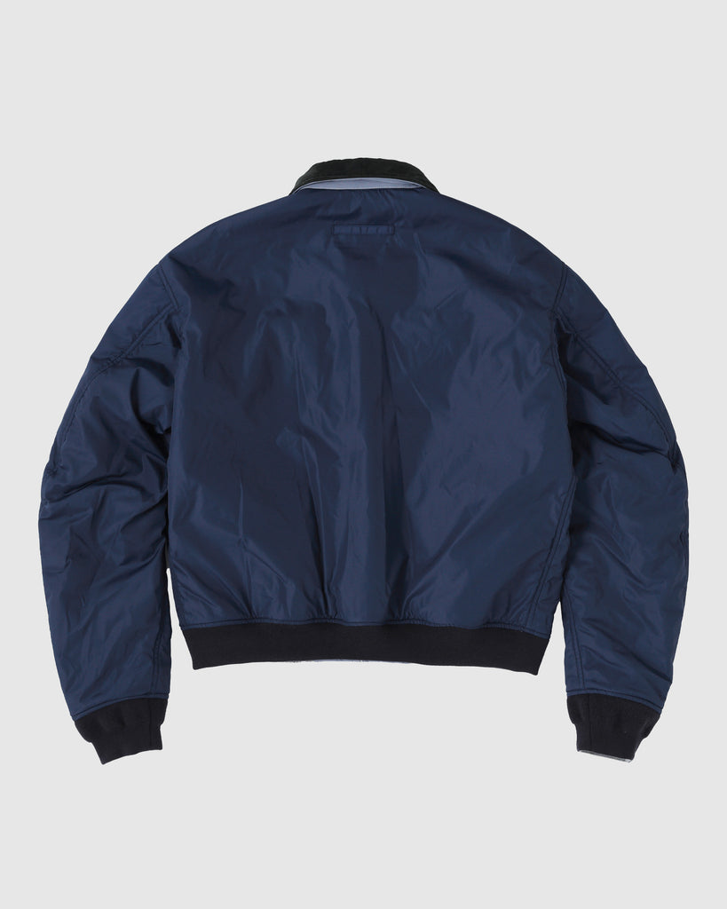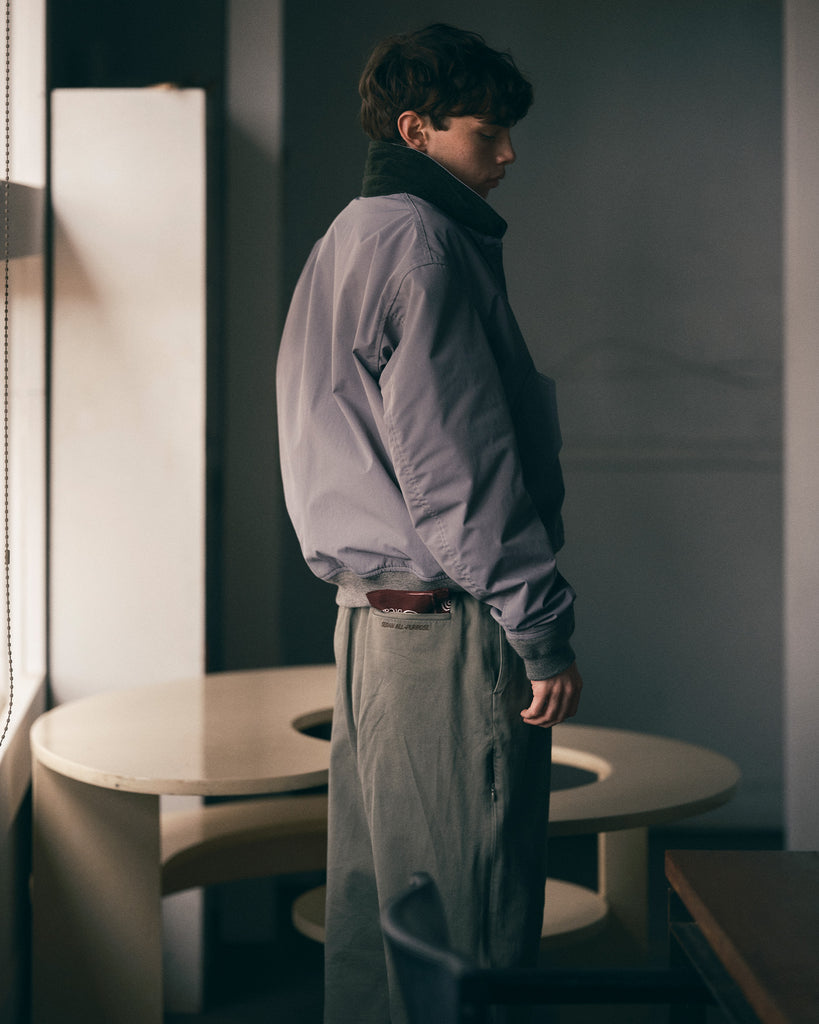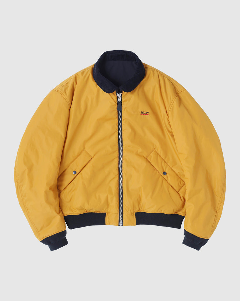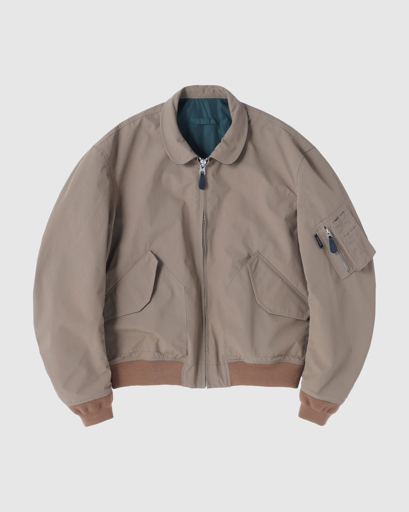 MA-1の影に隠れてなかなか日の目を浴びることのないミリタリージャケットCWU-36P。ミリタリーのくせに可愛げのある丸い衿、変な形のパッチポケットと愛くるしいデザインだと思うのは私だけでしょうか。そんなこのジャケットに光を当てるべく、リバーシブルに。表地には2層の張りのある生地を採用。また中綿にはPRIMALOFT®、裏側には高密度のナイロンに衿だけコーデュロイと、某オイルドジャケットよろしくなデザイン。このジャケットのために編み上げたリブも表裏で異なるカラーにするこだわりの1着。ロゴ入りのドットボタン。裏側の左胸にロゴ刺繍。