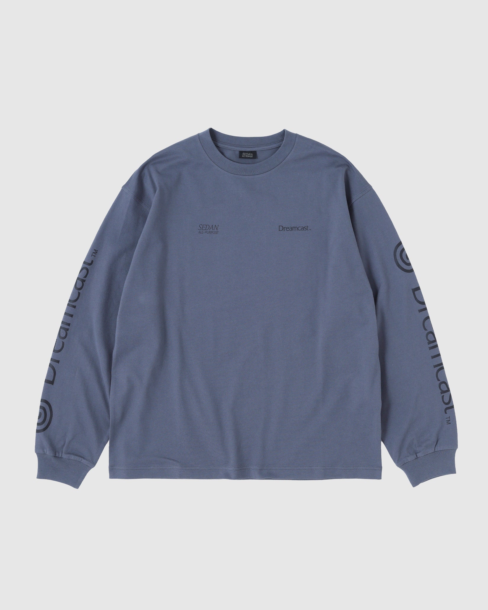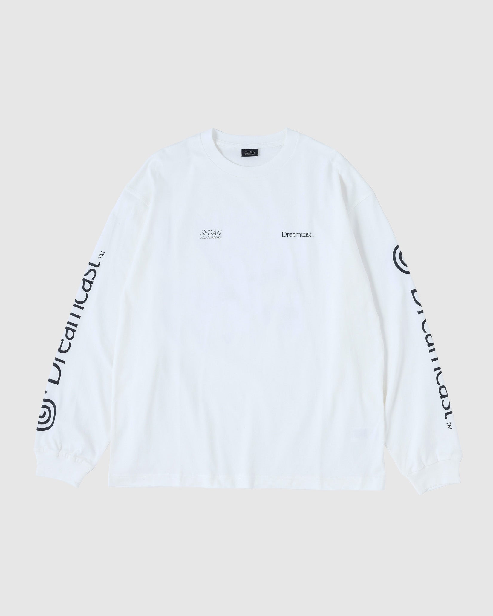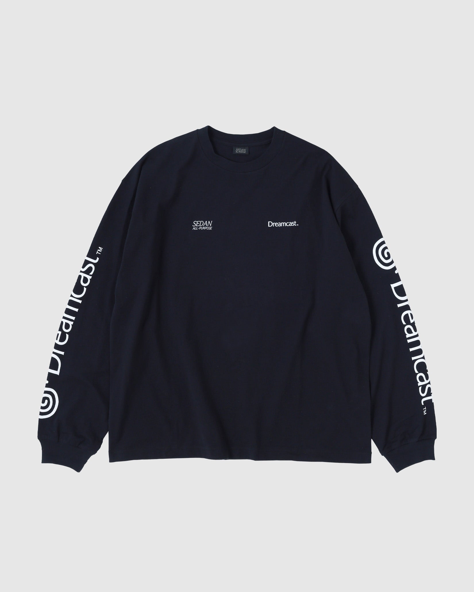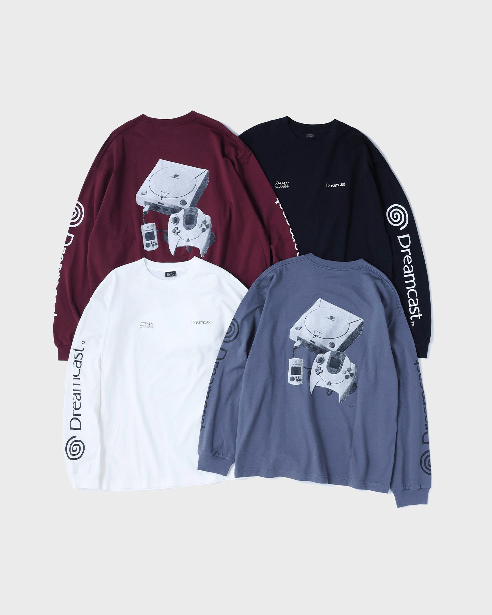 ネットワーク機能を標準搭載したセガ最後の家庭用ゲーム機であるDreamcast(ドリームキャスト)。エンターテイメントの未来を先取りするマシンとして誕生した「夢のゲーム機」。本格的なオンラインコミュニケーション 機能を持つ、業界初の家庭用ゲーム機である。 そんなドリームキャストとセダン オールパーパスのコラボレーションアイテムを作成しました。ドリームキャストが持つ革新性はアメリカンカルチャーから新しい発想でモノづくりをする日本発のブランドであるセダン オールパーパスとの相性も良いのではという想いから今回のコラボレーションに至りました。ロングスリーブTシャツは両胸と袖にロゴプリント。背面には網点でつくったドリームキャスト本体のフォトプリントが入ります。