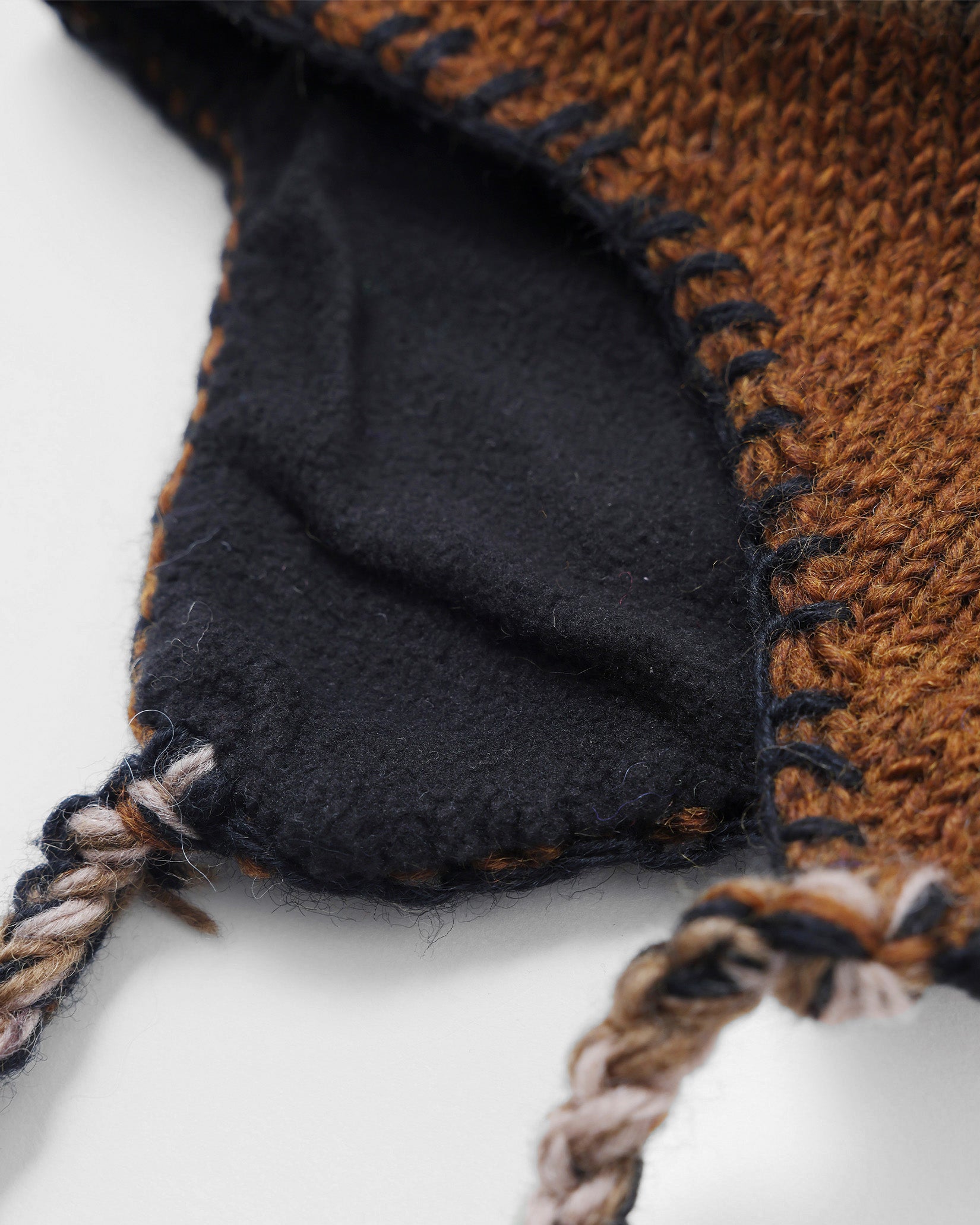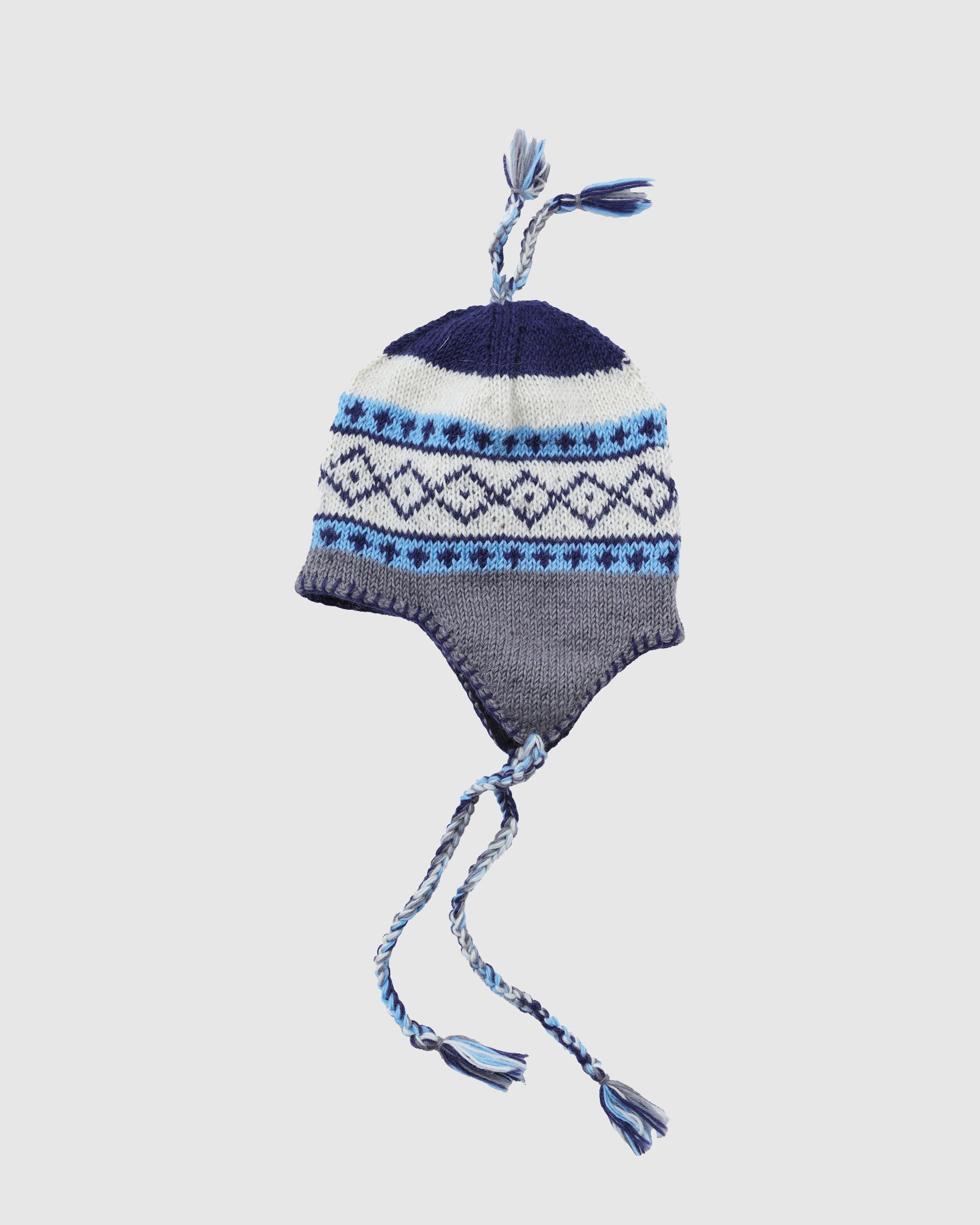 ネパールで手編みして作ってもらった耳当て付きのニットキャップです。あったかそうな太番手のウールで、裏地にはフリースが付きます。耳あての下から出ている三つ編みが気に入ってます。民族調の柄2色と無地2色の展開。