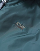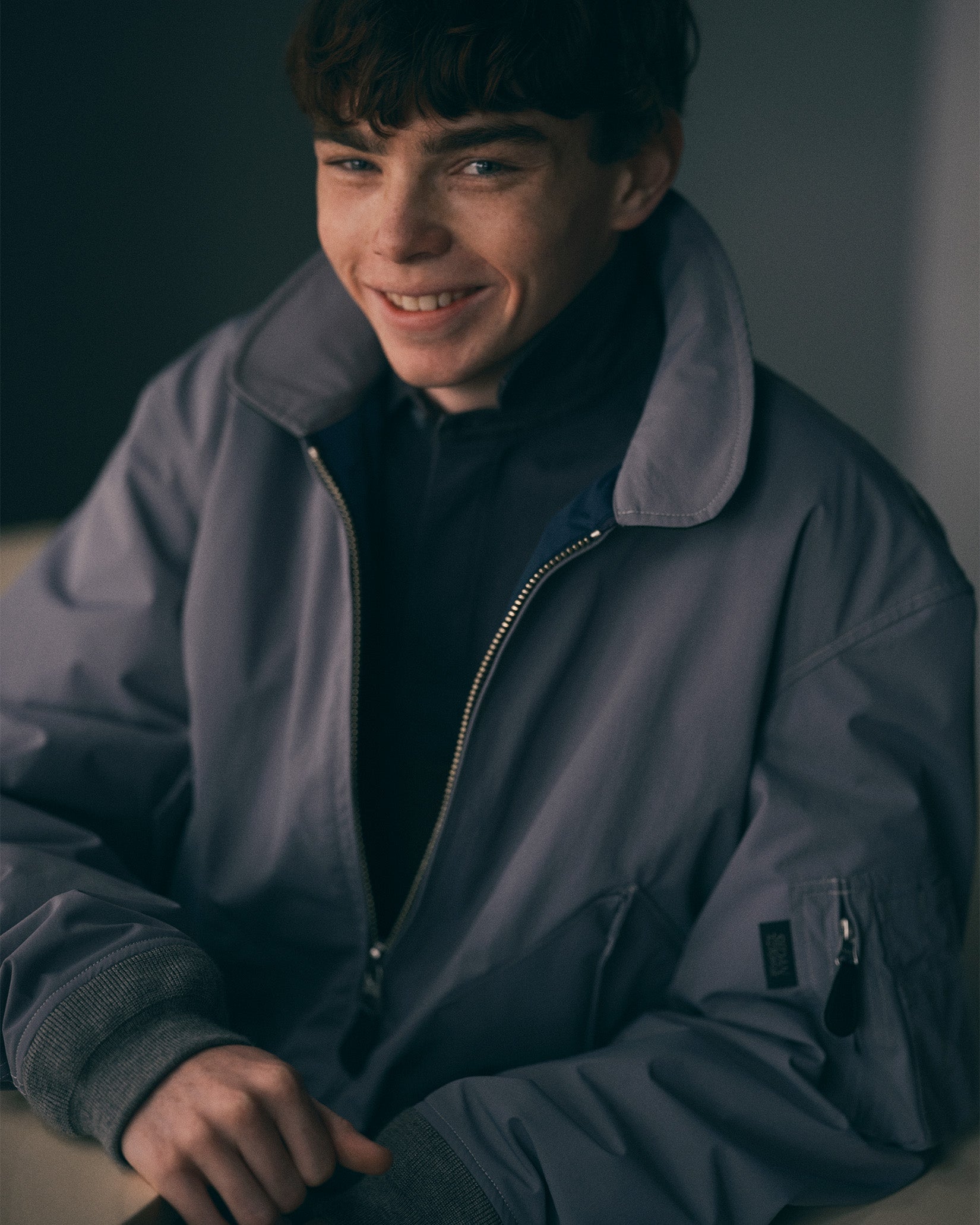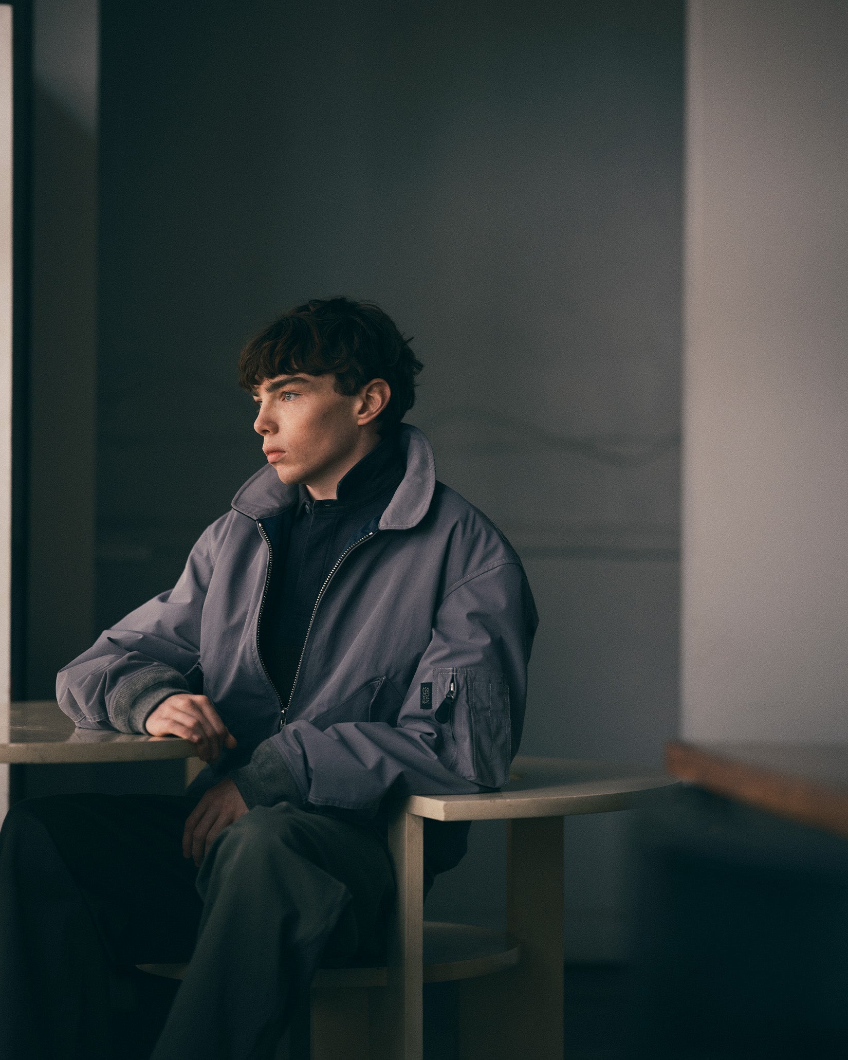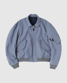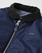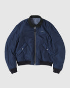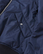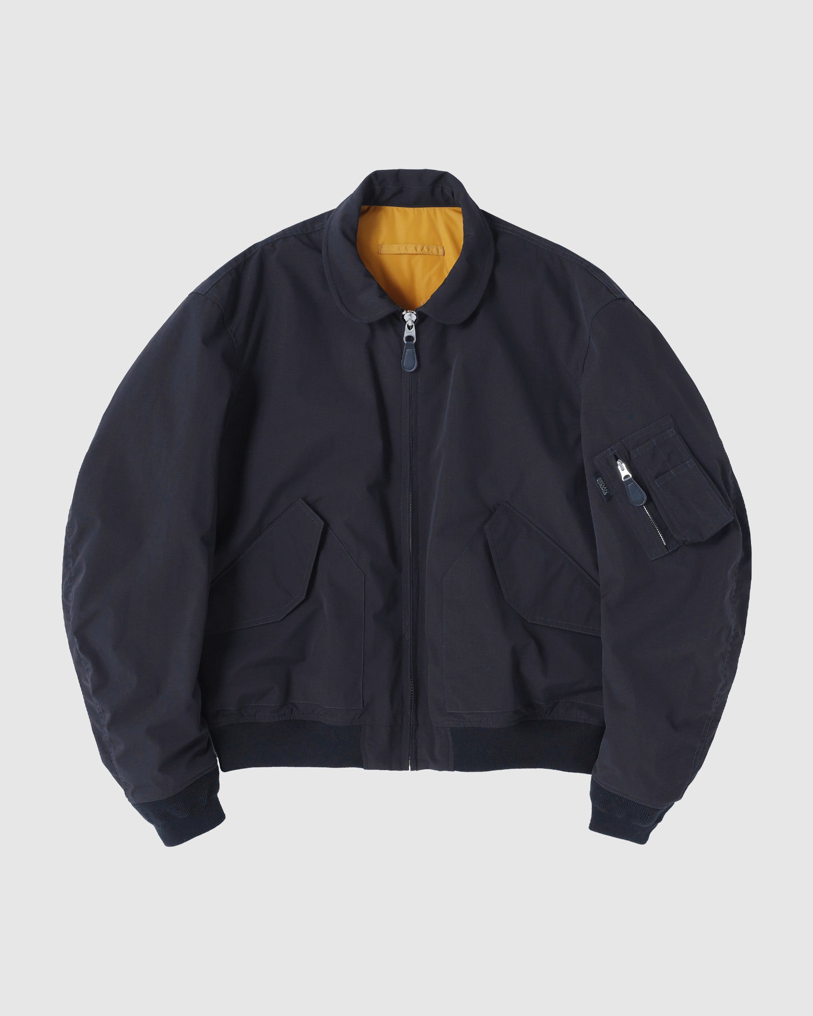 MA-1の影に隠れてなかなか日の目を浴びることのないミリタリージャケットCWU-36P。ミリタリーのくせに可愛げのある丸い衿、変な形のパッチポケットと愛くるしいデザインだと思うのは私だけでしょうか。そんなこのジャケットに光を当てるべく、リバーシブルに。表地には2層の張りのある生地を採用。また中綿にはPRIMALOFT®、裏側には高密度のナイロンに衿だけコーデュロイと、某オイルドジャケットよろしくなデザイン。このジャケットのために編み上げたリブも表裏で異なるカラーにするこだわりの1着。ロゴ入りのドットボタン。裏側の左胸にロゴ刺繍。