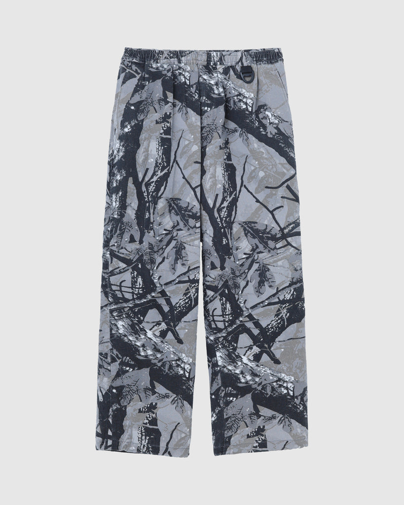 リアルツリー系のカモフラージュプリントの生地に加工してワイドフィットのイージーパンツを作りました。程よくフェードした加工で合わせるトップスを意外と選ばないのも良いところ。本来ミリタリーやハンティング要素の強いアイテムが多いので、あえてリラックスして着れるトラックパンツにしてみました。キーホルダーをぶら下げるD管や脇に付けたベンチレーションのメッシュなどディティールにもこだわった1本です。ウエストはゴムと紐で調節可能。裾のドローコードで絞って履くことができます。