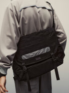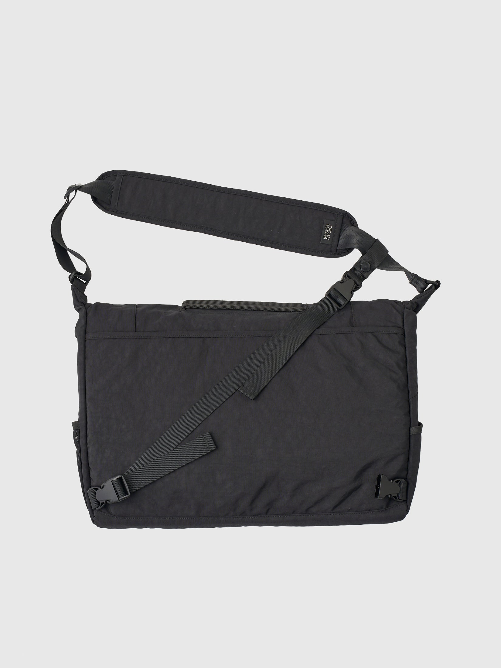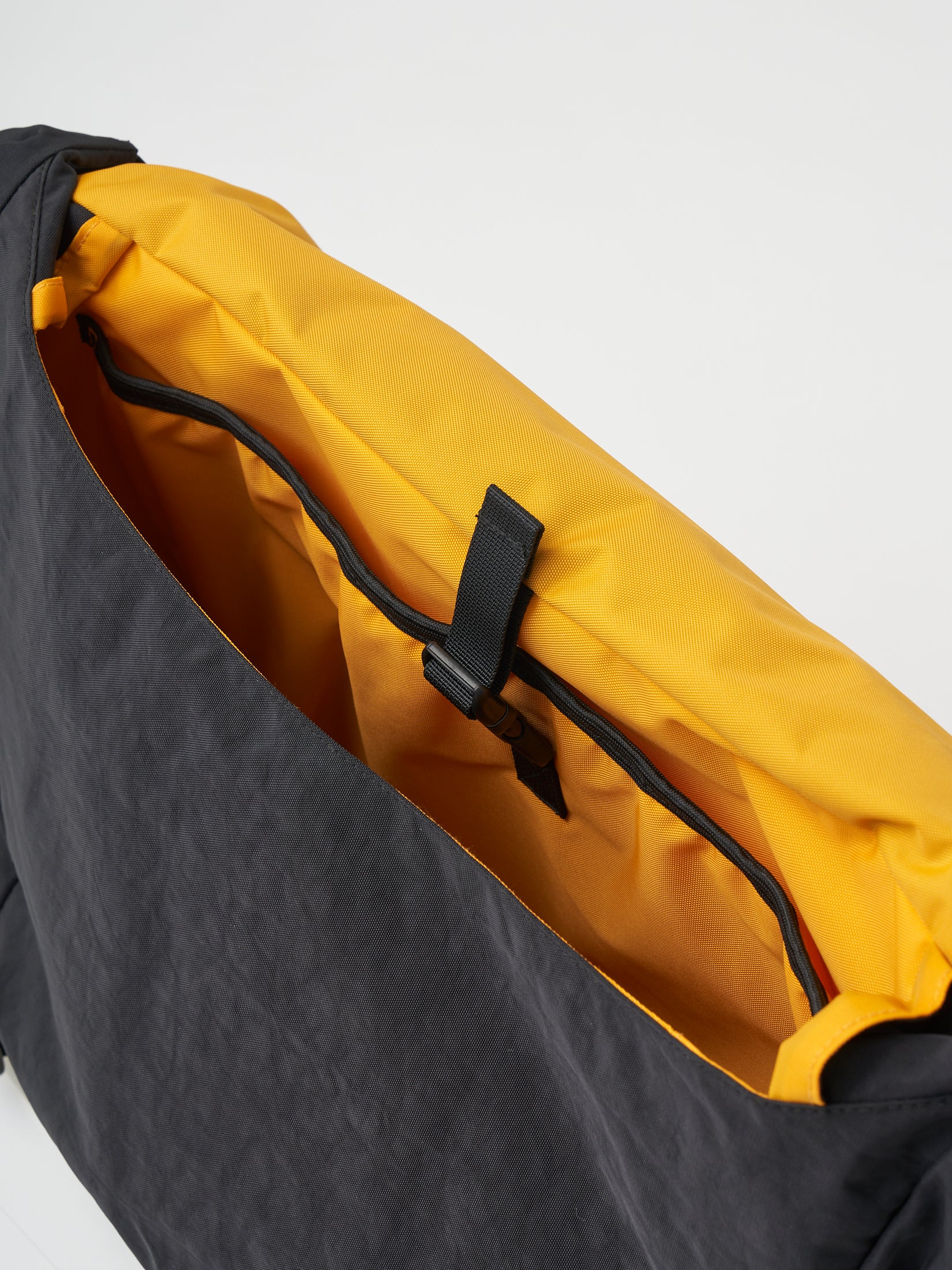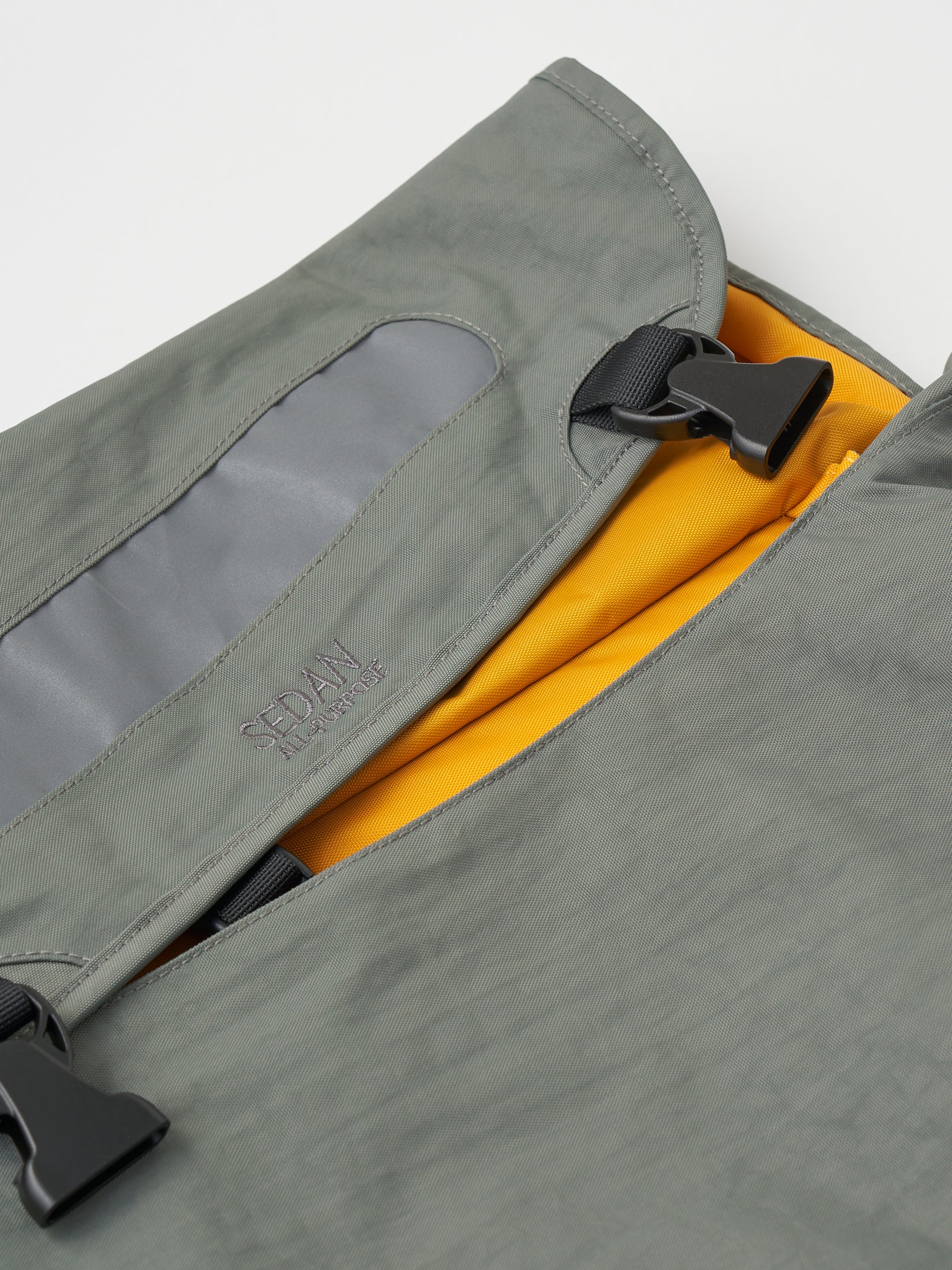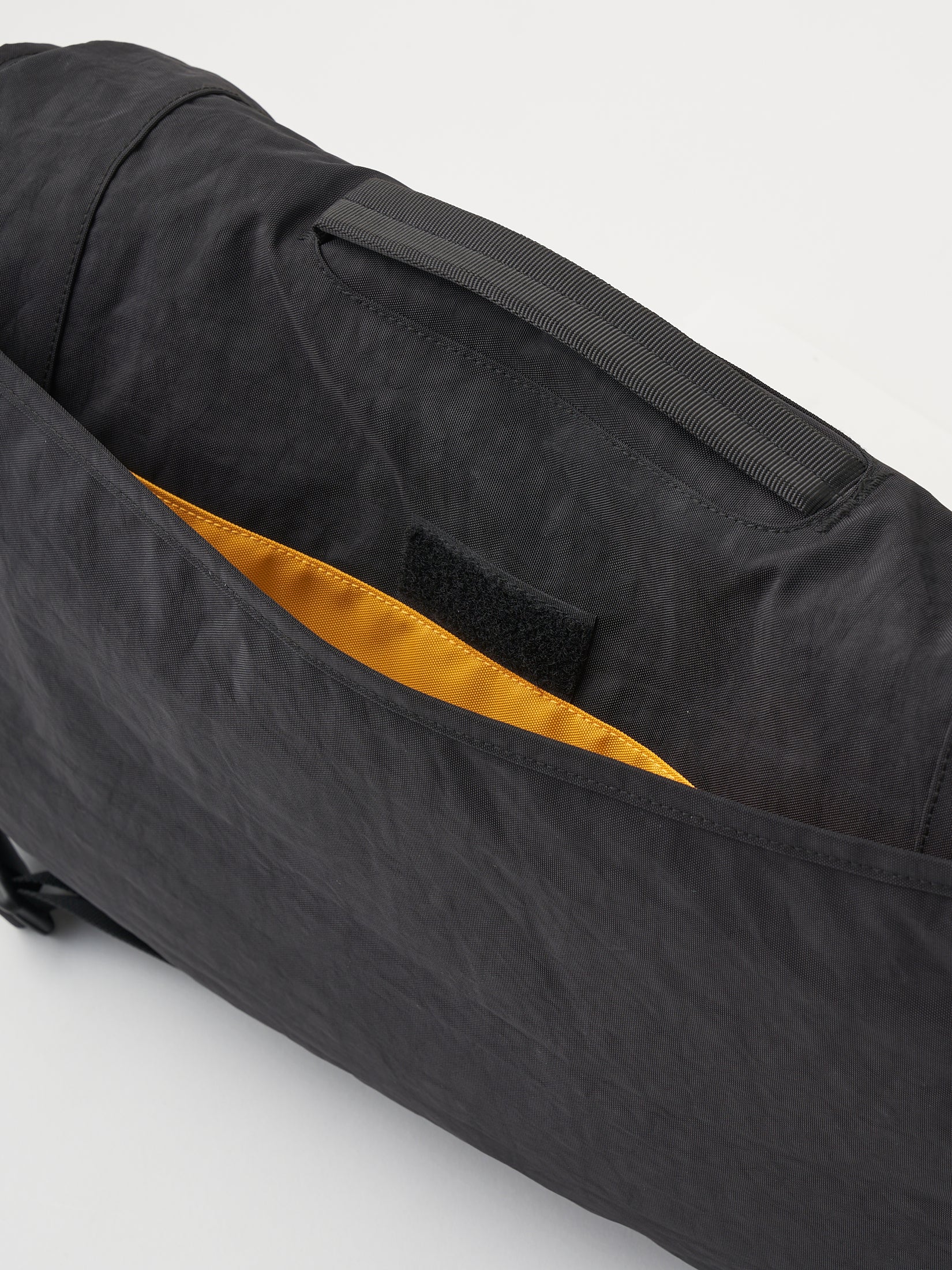 ピストが大流行りしていた頃メッセンジャーバッグを使っていた。その後もロイヤルメールだのニュースペーパーバッグだの、斜めがけバッグをギュッと体に沿わせて使うバッグが大好きだった。ただいつの間にか自転車に乗らなくなり、メッセンジャーバッグを使うのをなんとなく遠慮していたが、春に作ったスリングバッグを使っていると気負いなく使えるメッセンジャーバッグを使いたい欲がふつふつと湧いてきた。あまりにもストレートすぎると恥ずかしいのもあり、製品染めしたオックスフォードナイロンを見つけたのでその生地でちょっと懐かしいメッセンジャーバッグを作った。これならテック系の人からアメカジの人まで使いやすいのではないかと思う。スリングバッグでも好評だった3点止めのベルトで、左右どちらでも背負える仕様にした。
