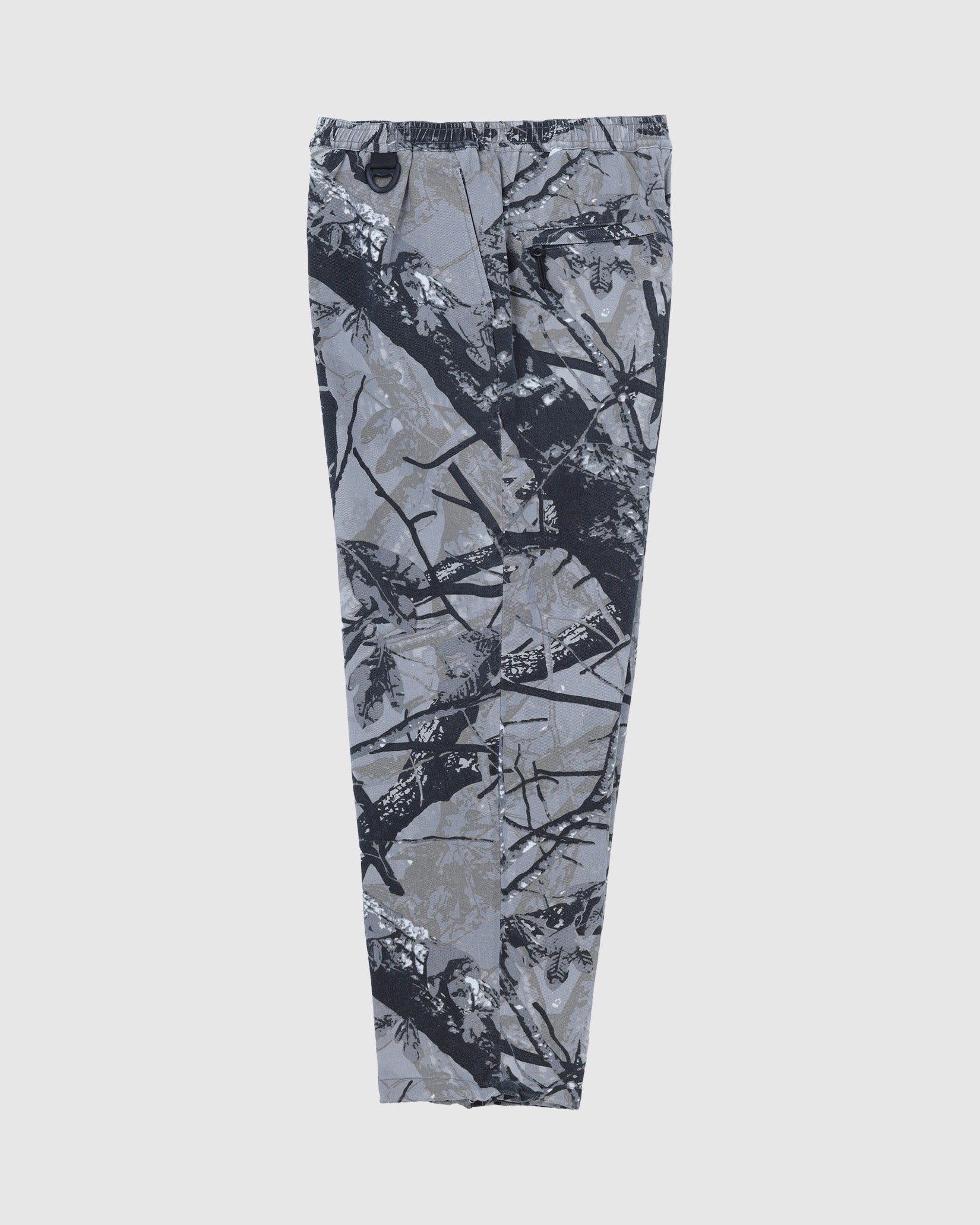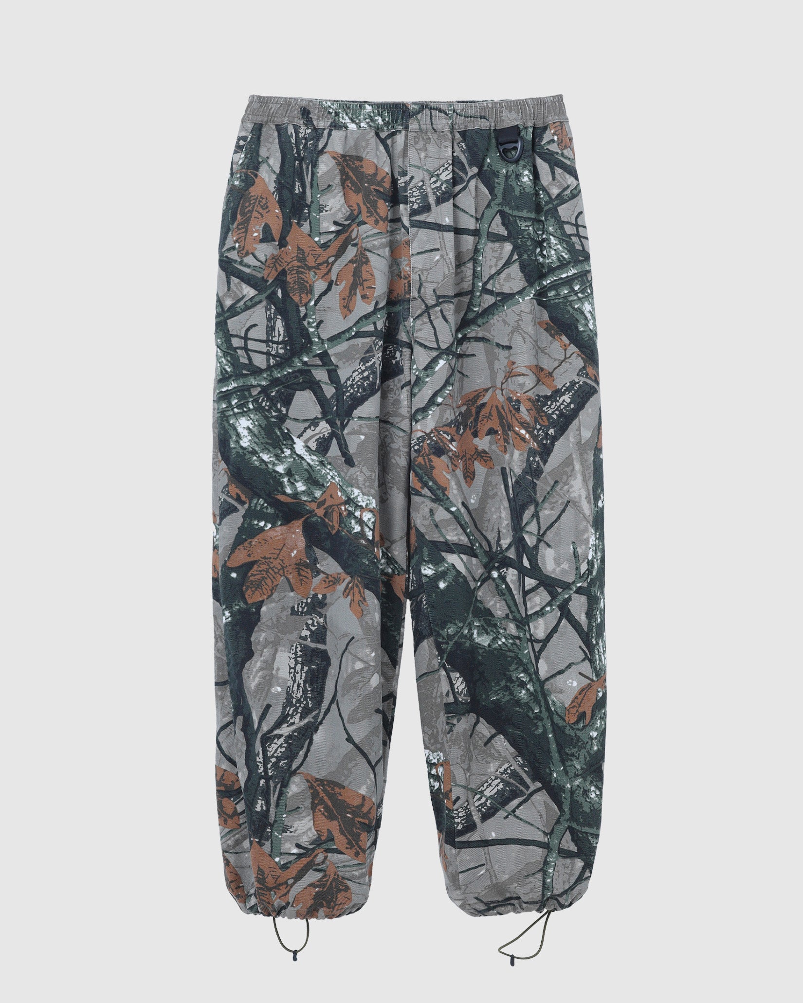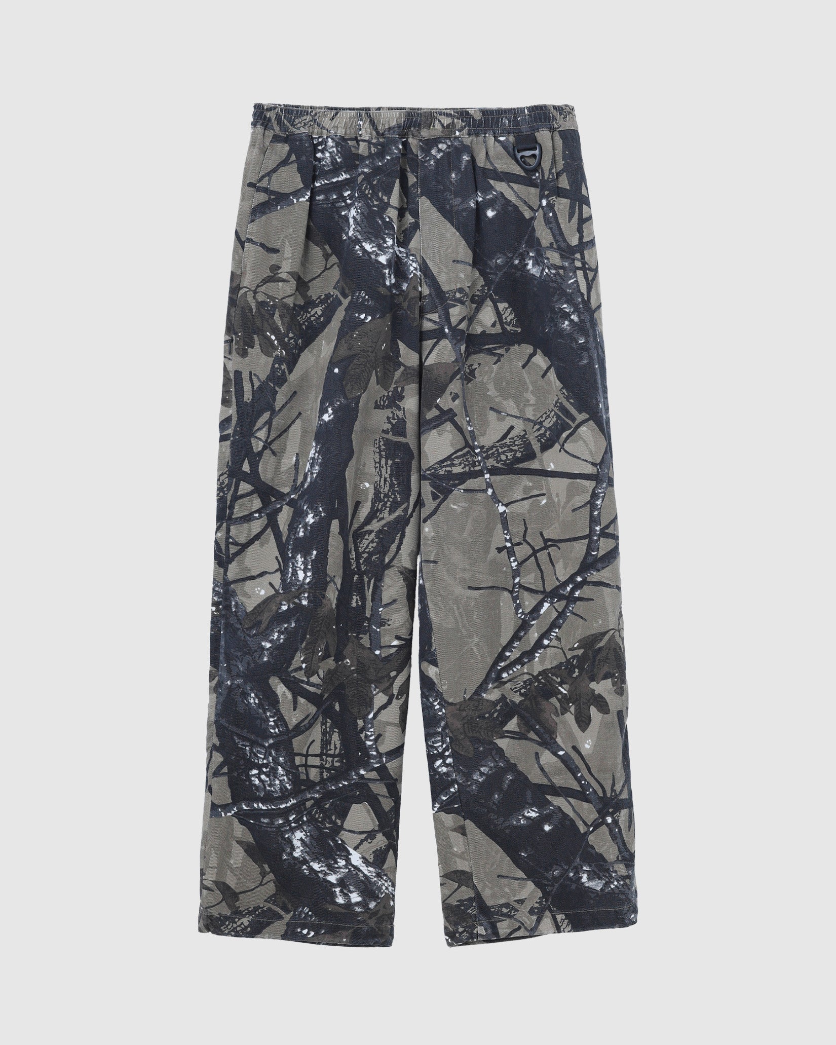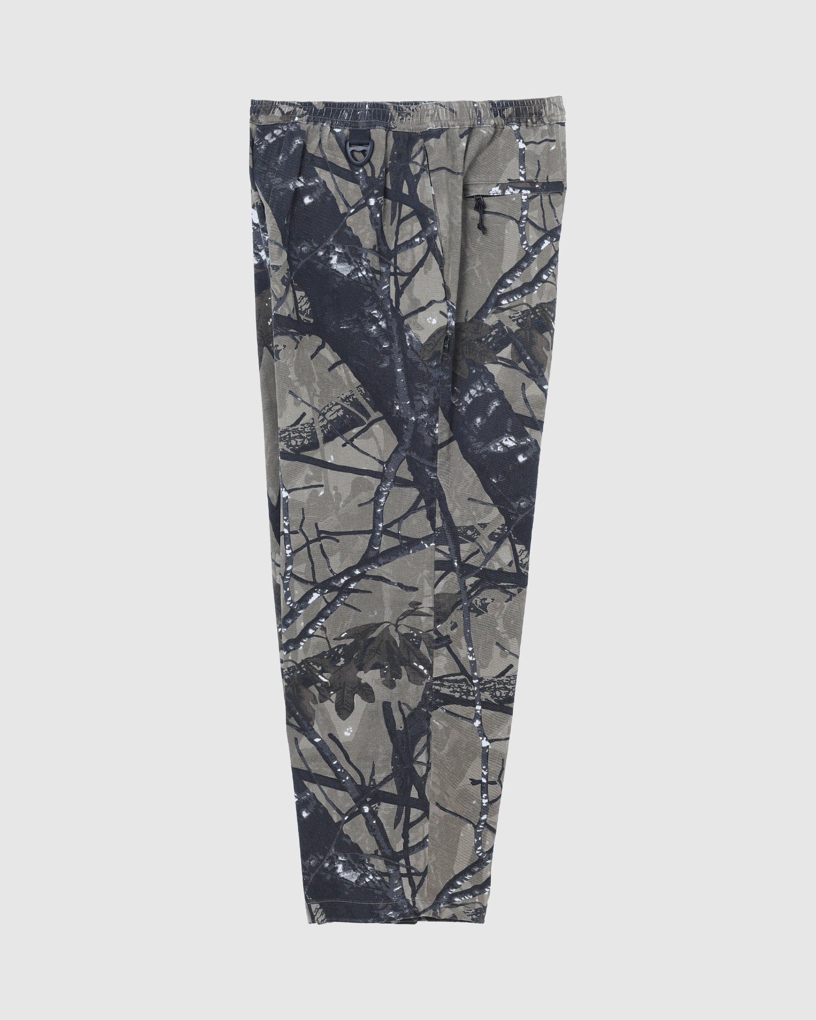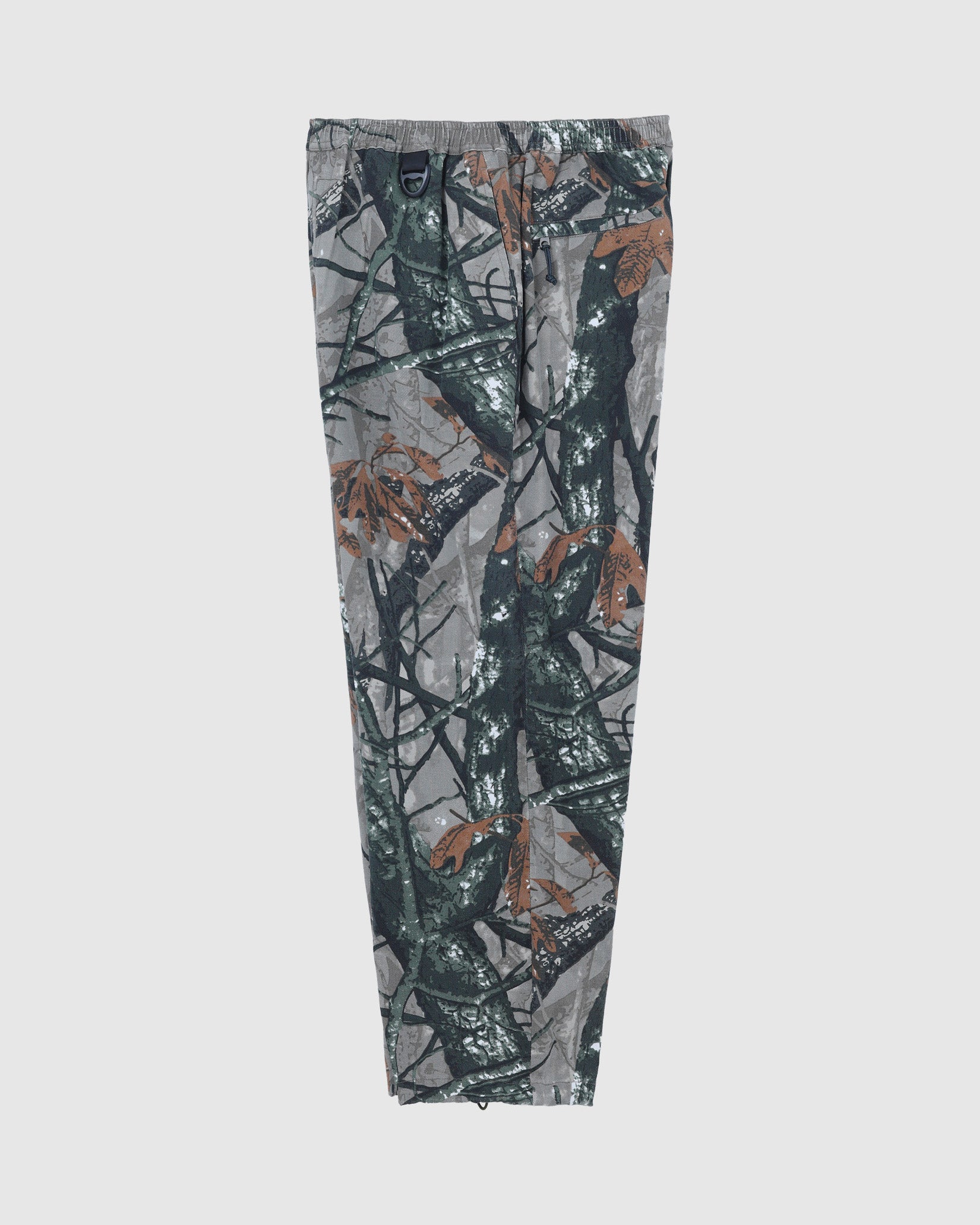 リアルツリー系のカモフラージュプリントの生地に加工してワイドフィットのイージーパンツを作りました。程よくフェードした加工で合わせるトップスを意外と選ばないのも良いところ。本来ミリタリーやハンティング要素の強いアイテムが多いので、あえてリラックスして着れるトラックパンツにしてみました。キーホルダーをぶら下げるD管や脇に付けたベンチレーションのメッシュなどディティールにもこだわった1本です。ウエストはゴムと紐で調節可能。裾のドローコードで絞って履くことができます。
