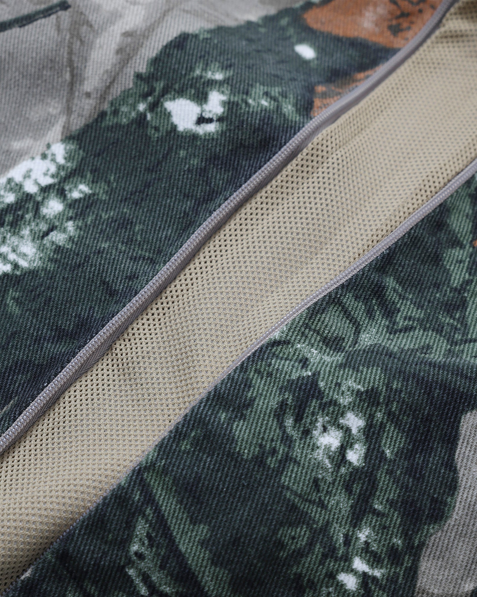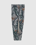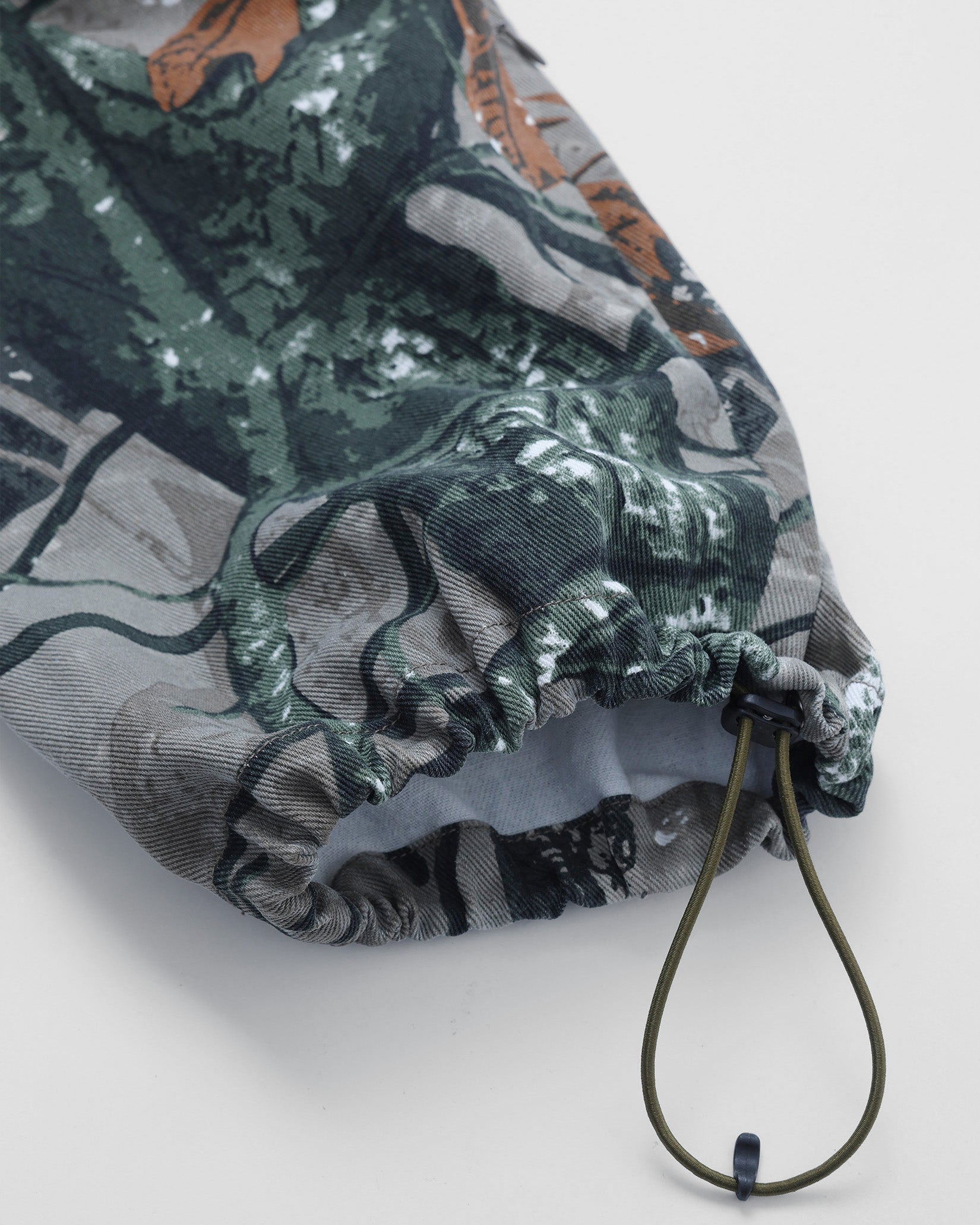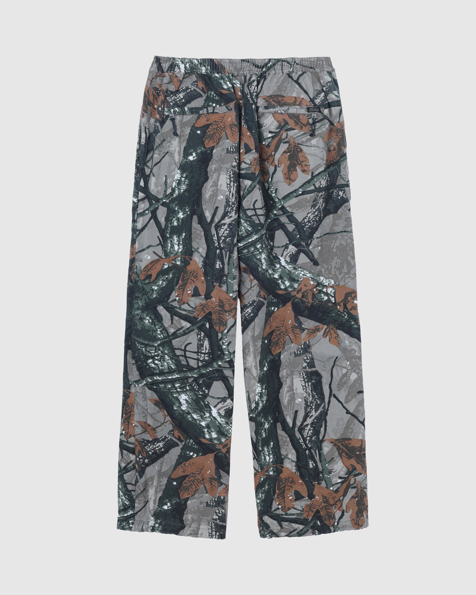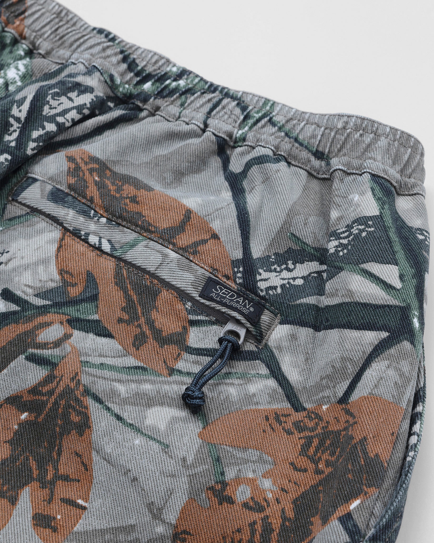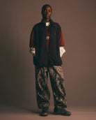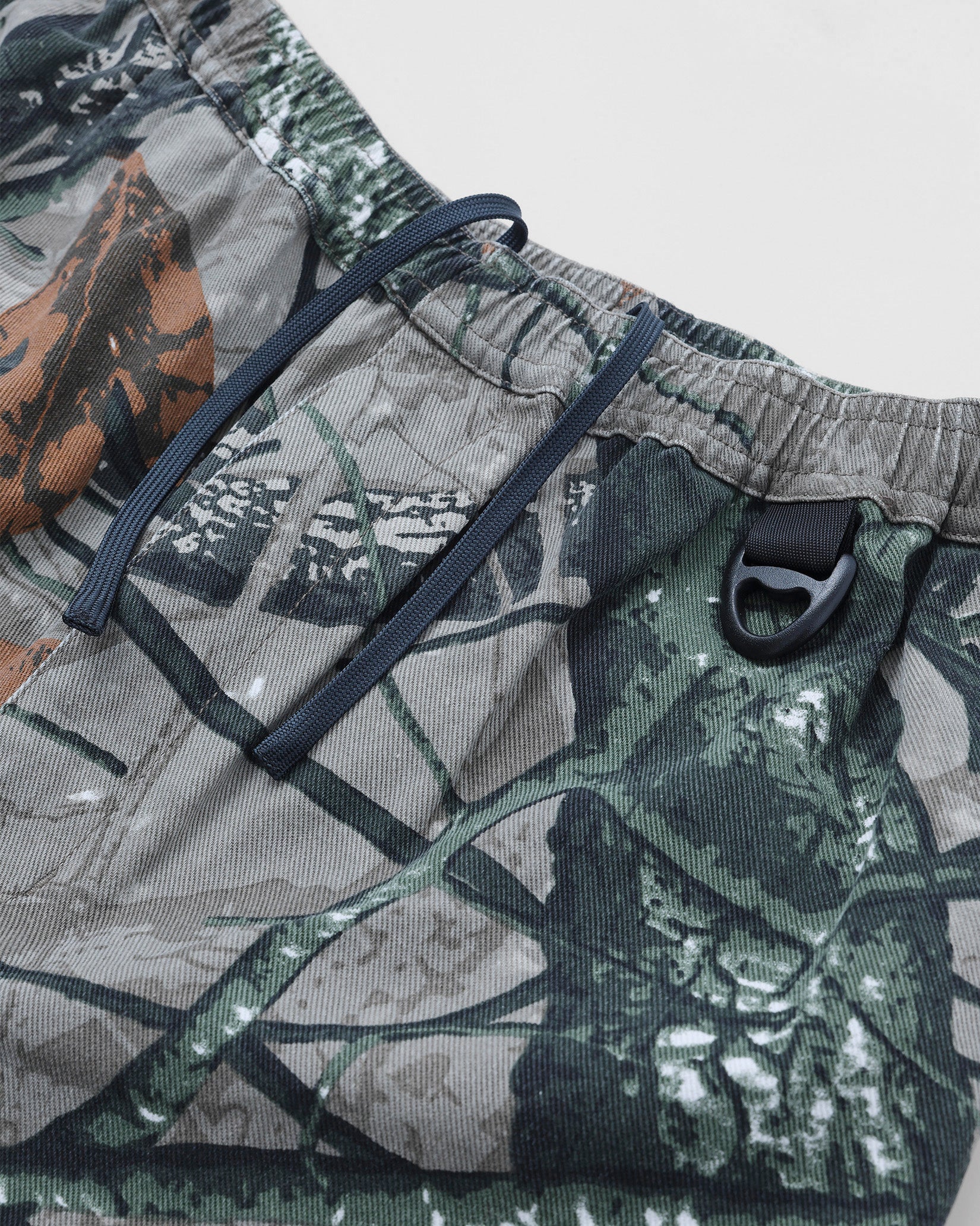 リアルツリー系のカモフラージュプリントの生地に加工してワイドフィットのイージーパンツを作りました。程よくフェードした加工で合わせるトップスを意外と選ばないのも良いところ。本来ミリタリーやハンティング要素の強いアイテムが多いので、あえてリラックスして着れるトラックパンツにしてみました。キーホルダーをぶら下げるD管や脇に付けたベンチレーションのメッシュなどディティールにもこだわった1本です。ウエストはゴムと紐で調節可能。裾のドローコードで絞って履くことができます。