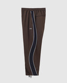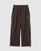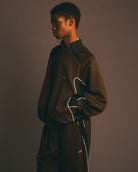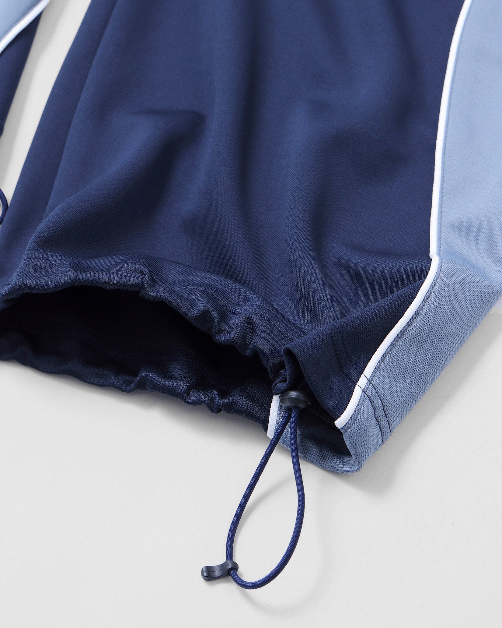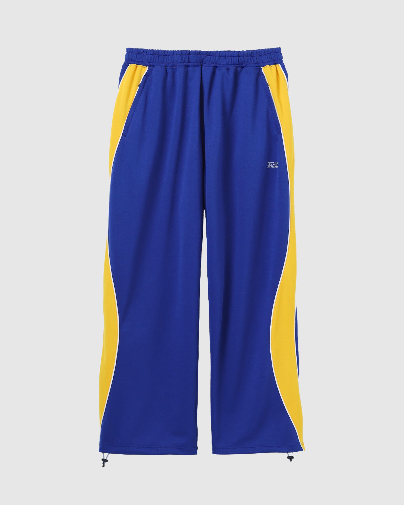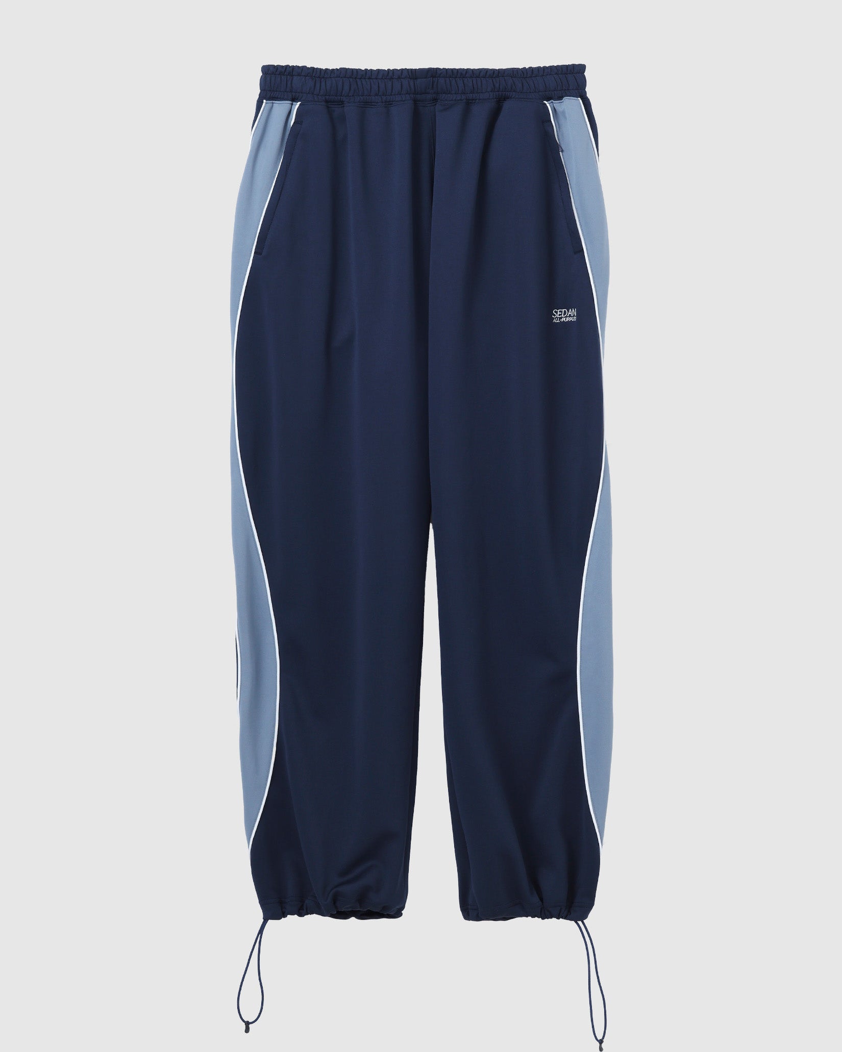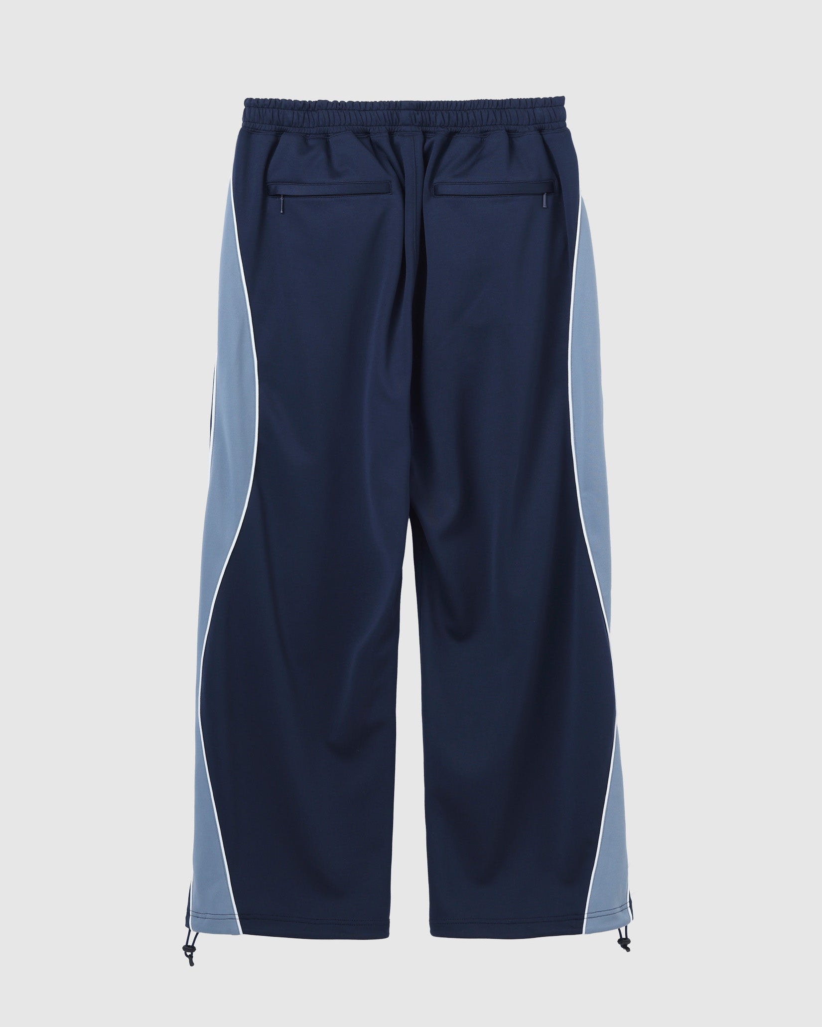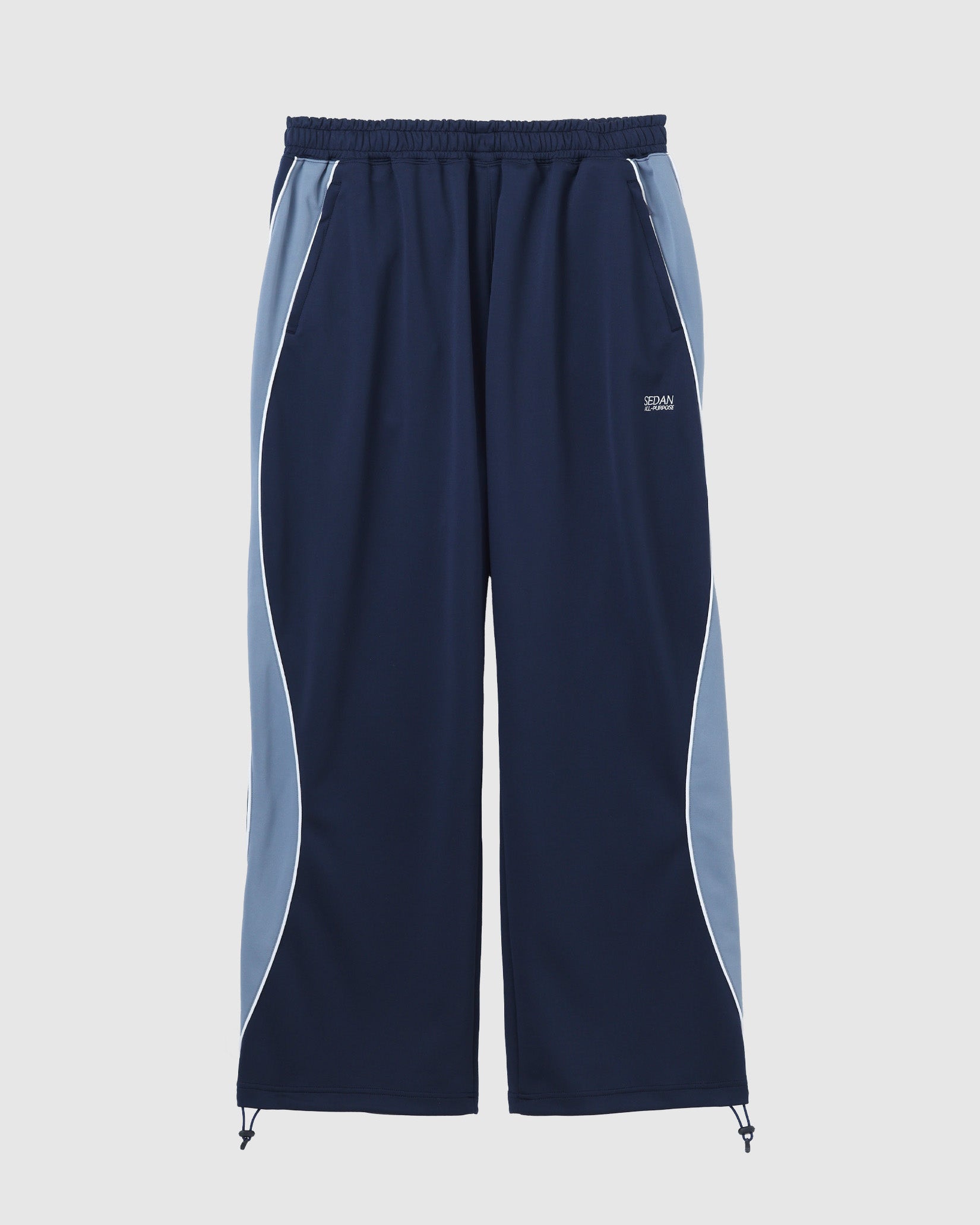 2000年代初頭の無駄に流線型を多用した服が作られた時代がある。スポーツからアウトドア、デニムに至るまでありとあらゆるジャンルで作っていたのが古着屋さんを周っているとわかる。そんな時代に影響を受けて、トラックパンツを作った。ポリウレタン無しでハイストレッチを実現した、AQUATWIST®の生地を使用。配色もレトロな物から今着たいカラーまで揃った3色展開。ウエストはゴムと紐で調節可能。左前太腿部にロゴ刺繍入り。裾のドローコードでシルエット調節可能。