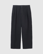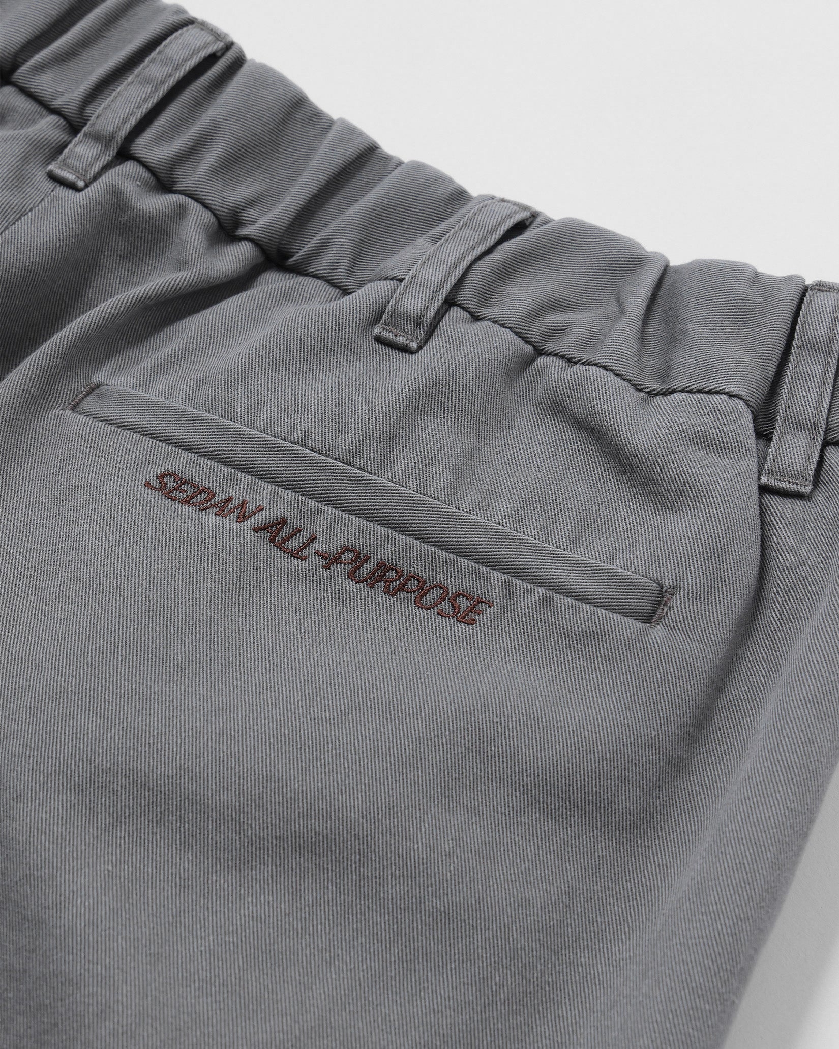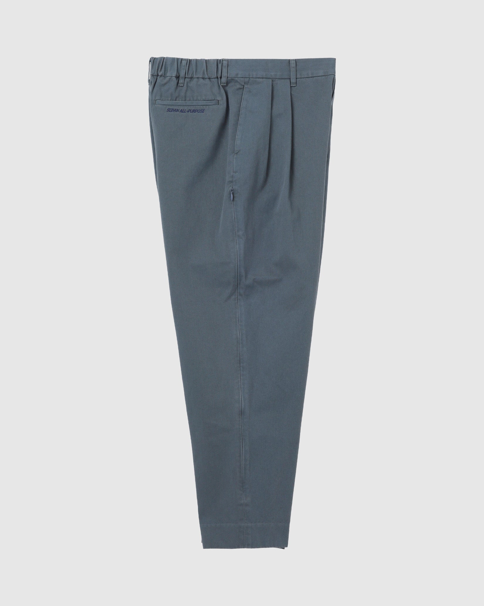昔から大好きでよく履いているコットンツイルのスラックス。履き込んだ雰囲気が出したかったので特殊な洗い加工を入れてもらいました。シルエットは2タック入りでややテーパードした一番履きやすいシルエット。ウエストの後ろ半分はゴムを入れて、紐もつくのでベルトレスでも履ける。ピンループ(ベルトを固定するためのループ)と紐で少し遊び心を加えつつ、脇のシーム部分にはファスナーで開閉できるメッシュのベンチレーション付き。かしこまったスラックスをちょっとだけカジュアルにしてくれる仕様です。なんとなく革靴よりもスニーカーやサンダルに合わせていただきたいスラックスですが、場面といろんな季節で使えると思います。ヒップポケット口にはロゴ刺繍入り。