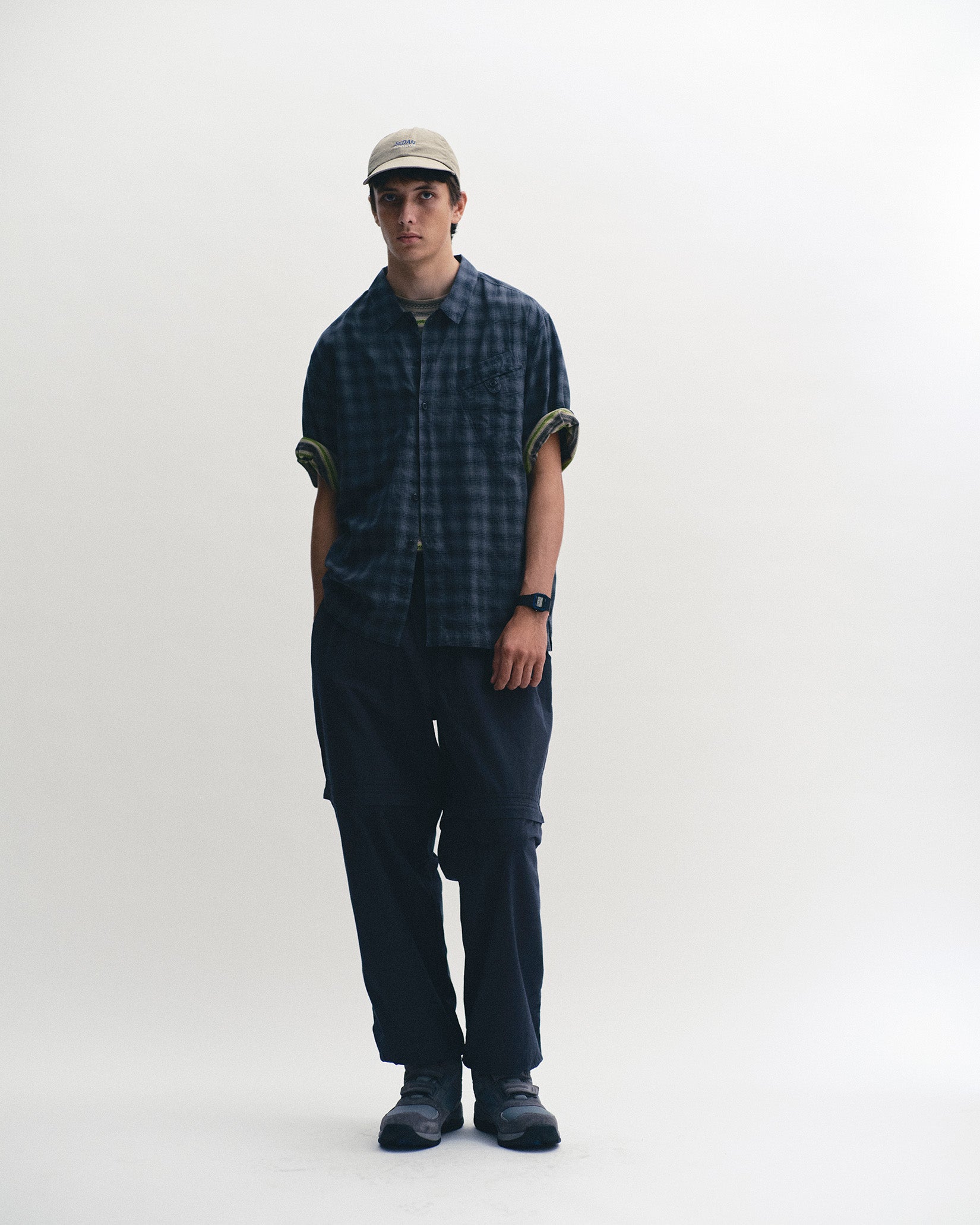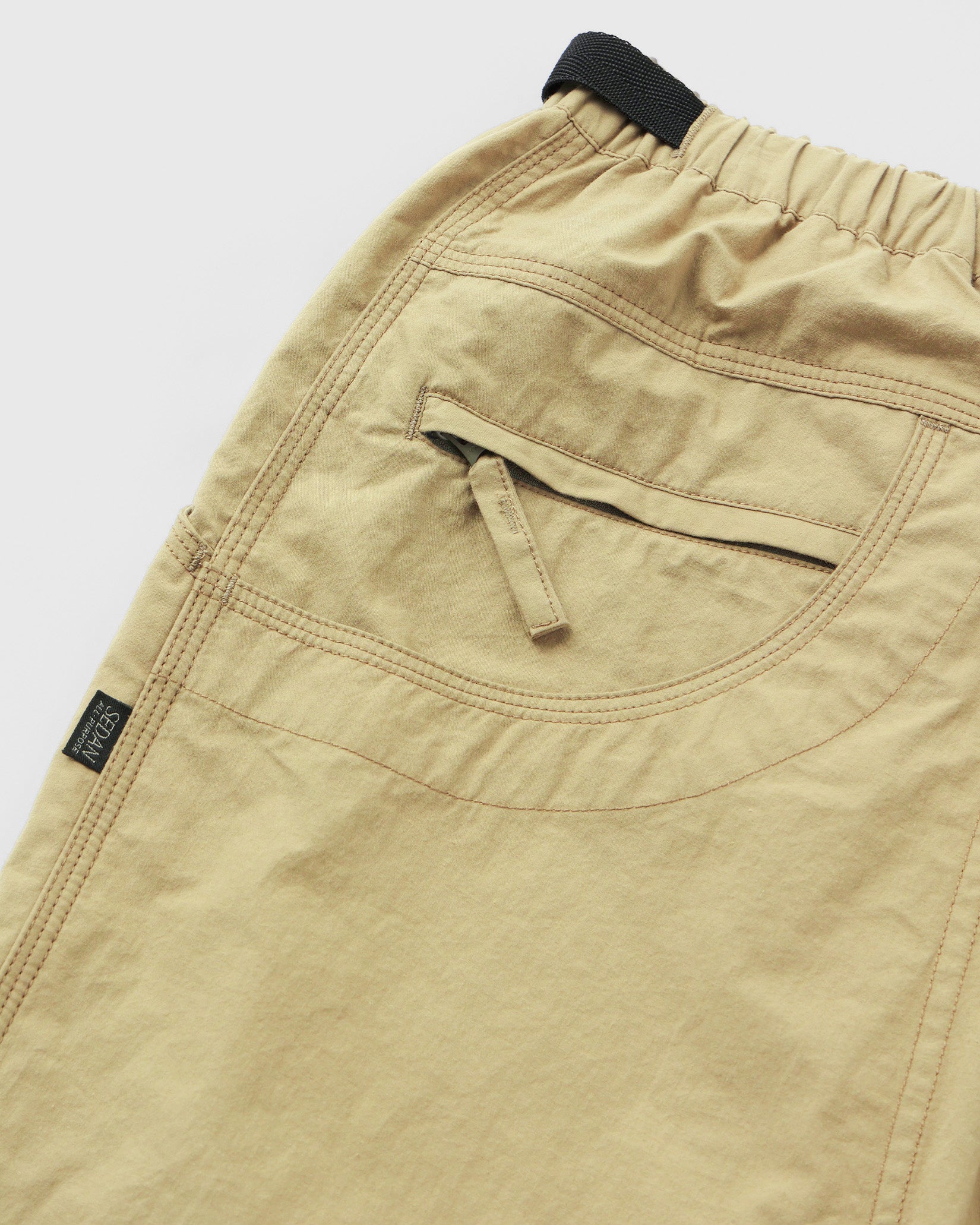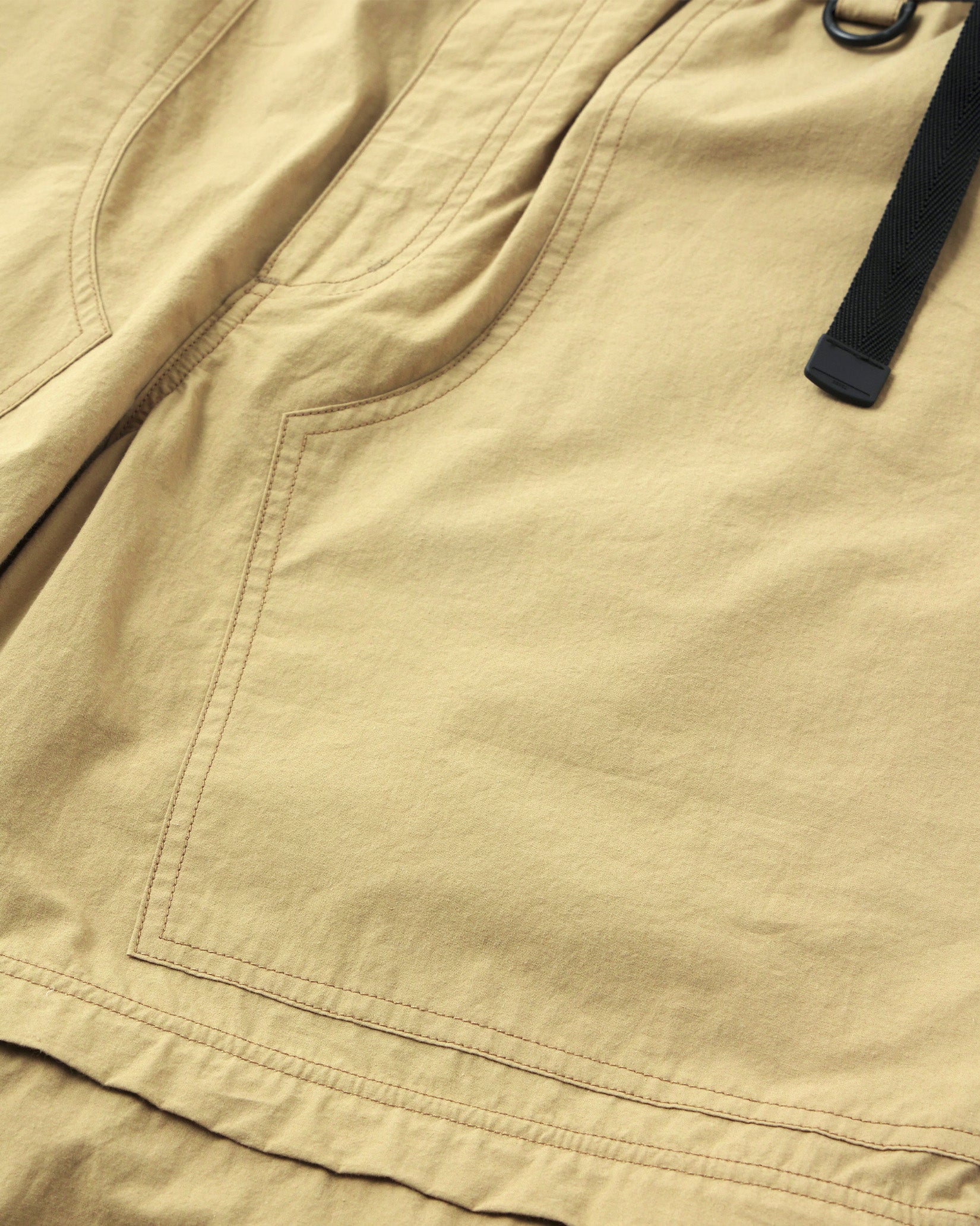 旅行に出張に使えると各方面から好評いただいているコンバーチブルパンツ。今シーズンはコットンタイプライターの生地に近江晒加工をした生地で作りました。今までは合成繊維で作っていましたがパンツはコットン派の皆様の声に応えて作ってみました。ダブルニーのディティールで、ショーツにした時にもパンチのあるデザインで春夏シーズンを通して長く履いていただけるのではないでしょうか。裾もゴムで絞ることができるので合わせるシューズも選ばないパンツとなっています。