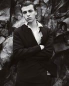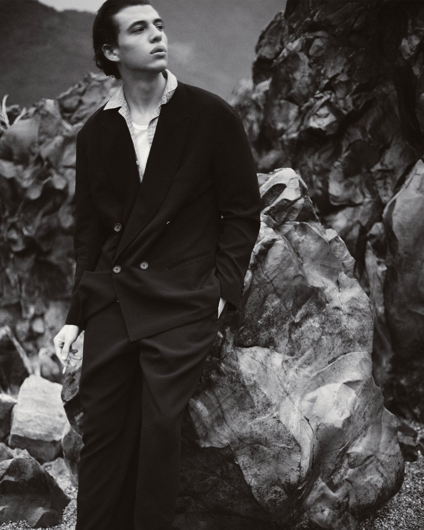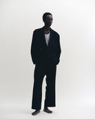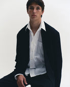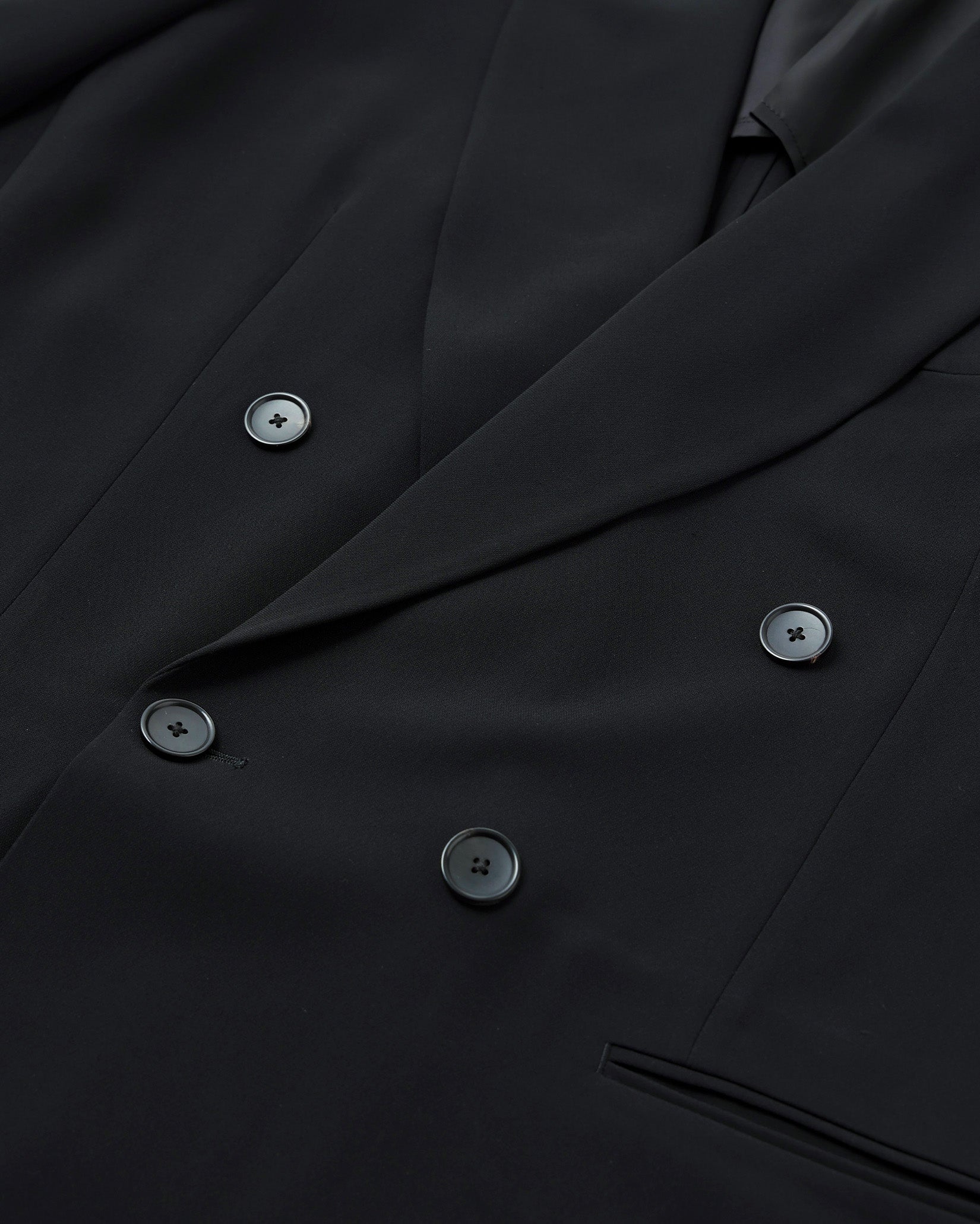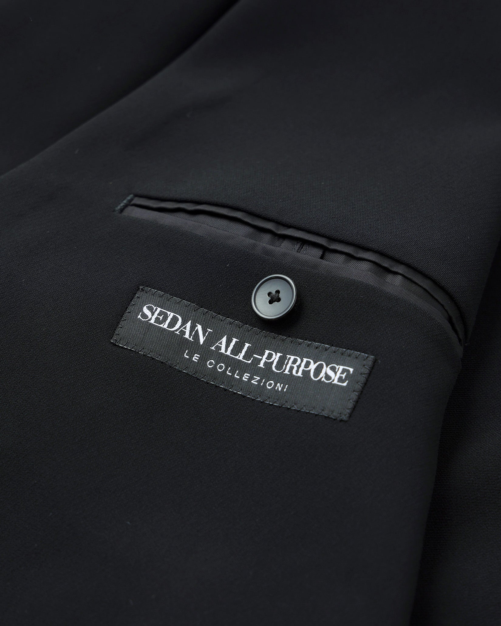 SEDANには各国にお手本というか憧れのデザイナーがいるのですが、スーツを作るならイタリアの巨匠や日本の暴力系映画監督の世界観をイメージした物をと考えていたのですが、ついに作ってしまいました。押さえるべきはなんといってもゆったりとしたスーツとしてのドレープ感。毛芯を入れたり、手作業でいせ込んだり…といった精密機械のようなスーツではなく、歩いた時の生地の揺れやちょっとしたセクシー感を出すべく、これまたレディースのスーツでよく使われていた憧れの素材、トリアセテートを使って作りました。同素材のパンツもあるのでスーツとしても着ることができます。