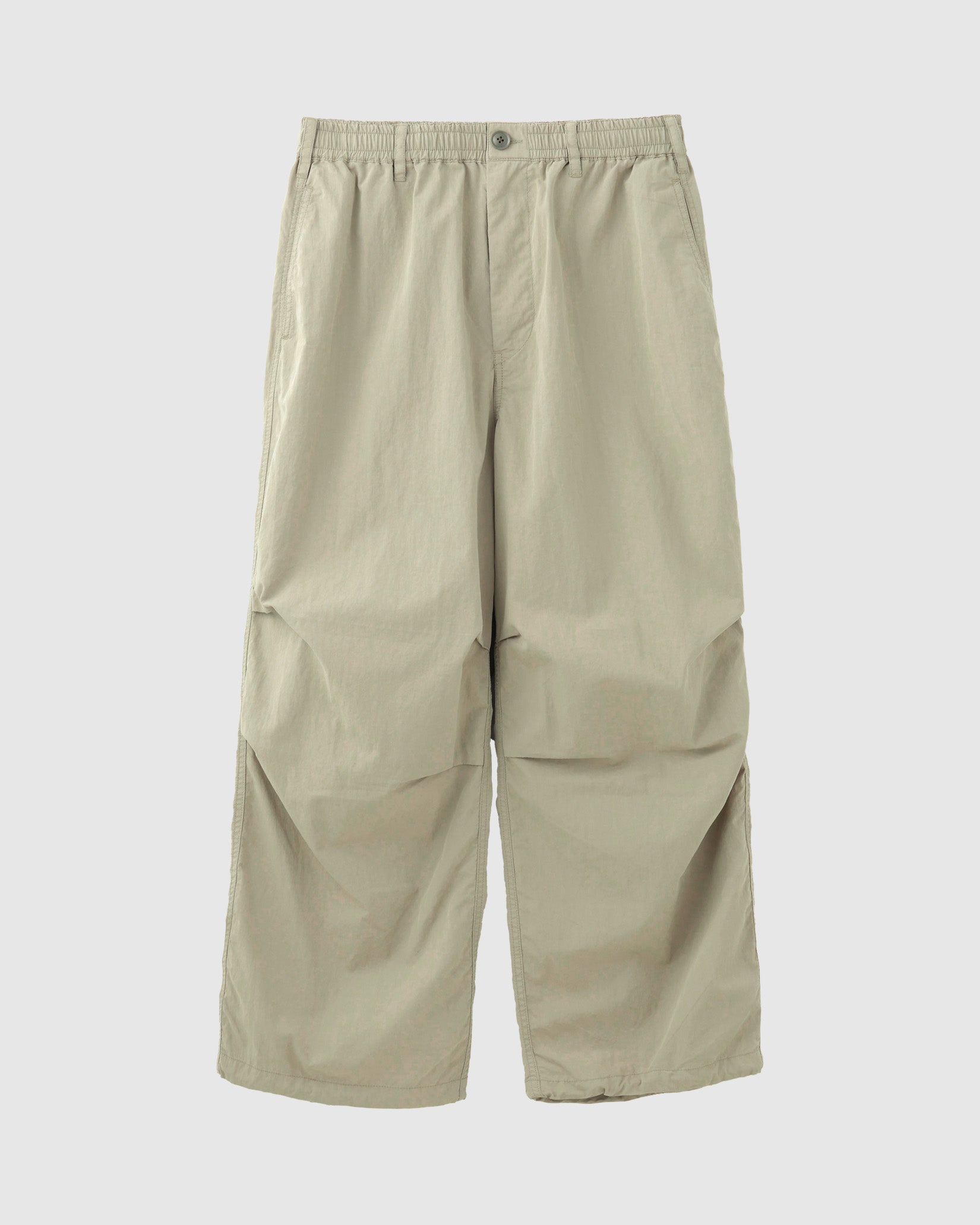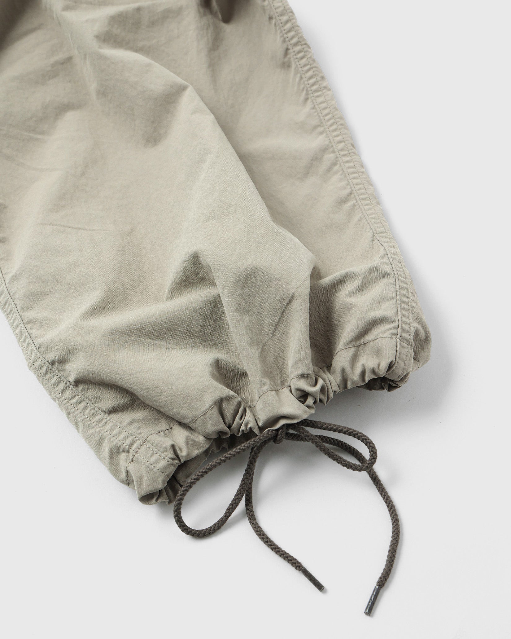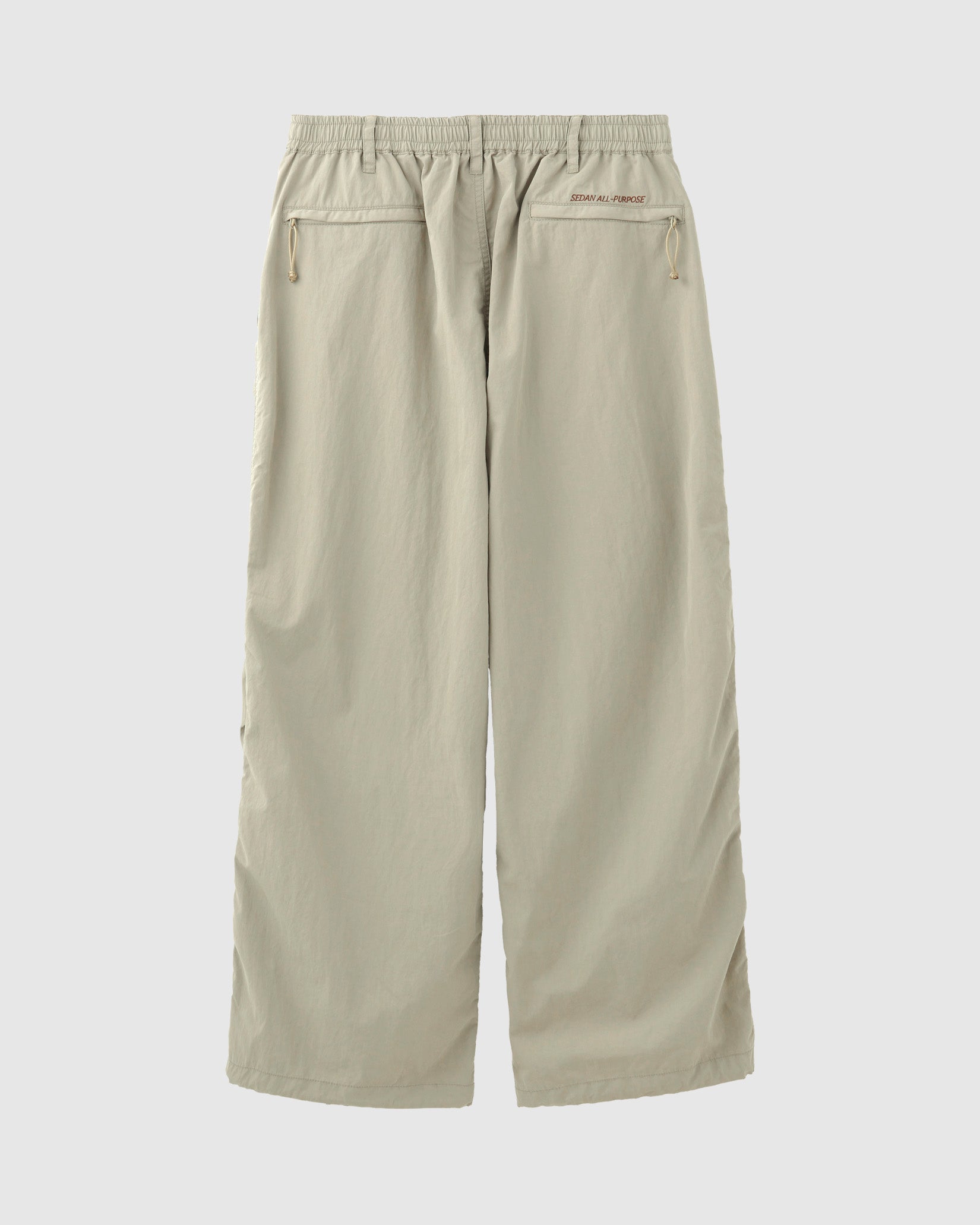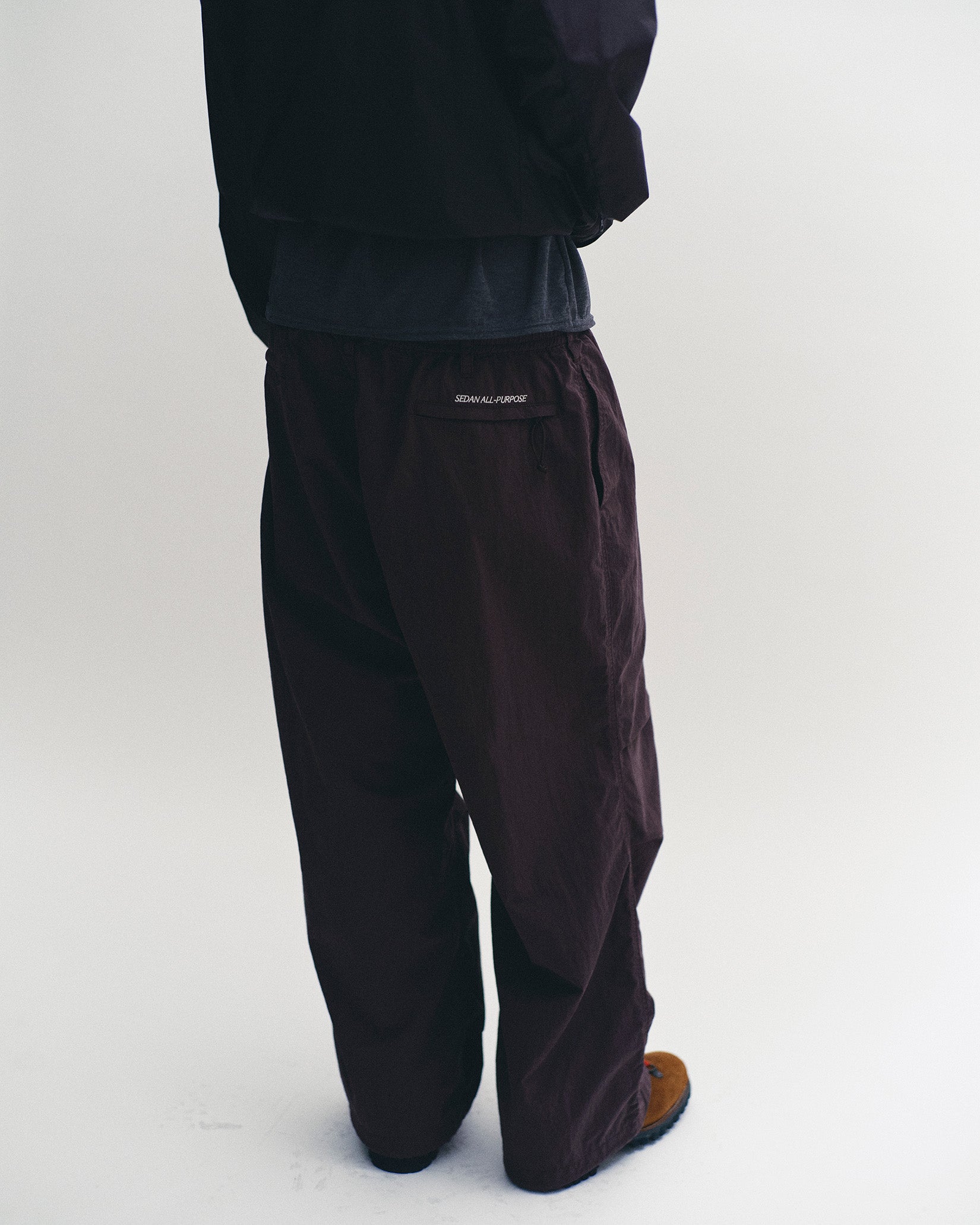定番で作っているオーバーパンツですが、今年は裾幅を広げてよりワイドフィットに。生地はコットンxナイロンで、製品洗いしているのでシャカシャカでもバリバリでもない雰囲気のある1本に仕上がりました。ウエストはゴム+紐、裾にも紐、バックポケットはファスナー開き。